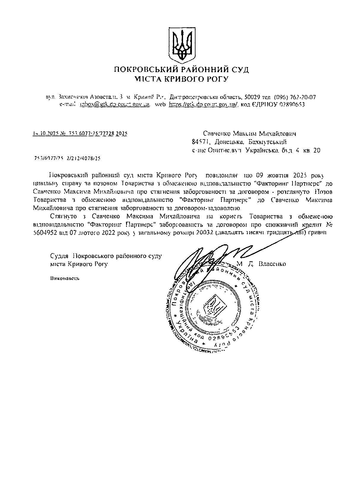 Повідомлення про розгляд цивільної справи за позовом ТОВ з обмеженою відповідальністю "Факторинг Партнерс" до Савченка Максима Михайловича про стягнення заборгованості за кредитним договором