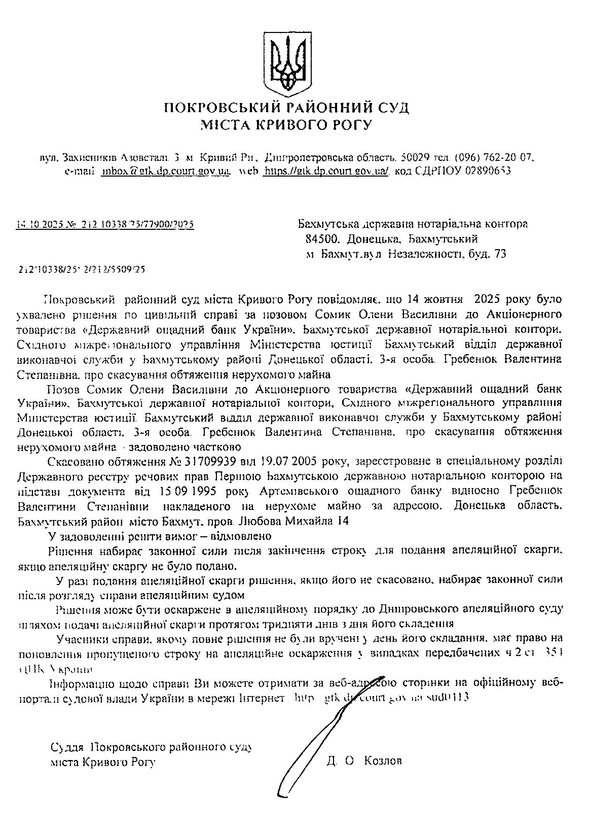 Повідомлення про розгляд цивільної справи за позовом Сомик Олени Василівни до Бахмутської державної нотаріальної контори