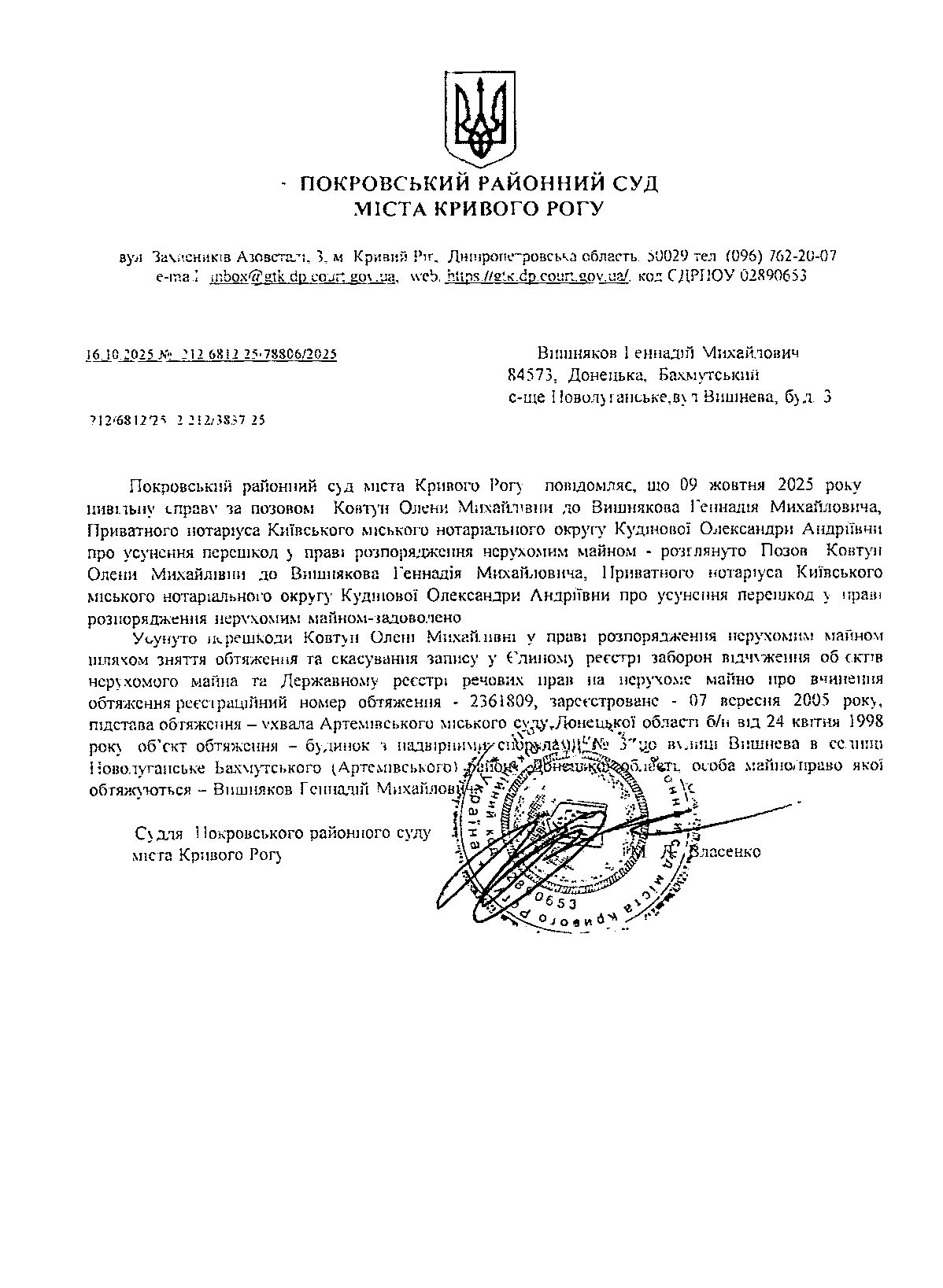 Повідомлення про розгляд цивільної справи за позовом Ковтун олени Михайлівни до Вишнякова Геннадія Михайловича