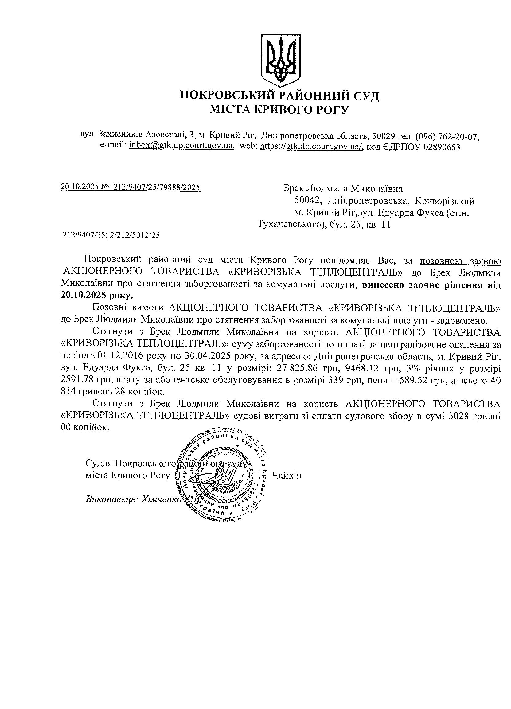 Повідомлення про розгляд цивільної справи за позовом Акціонерного товариства "Криворізька теплоцентраль" до Брек Людмили Миколаївни про стягнення заборгованості за постачання теплової енергії