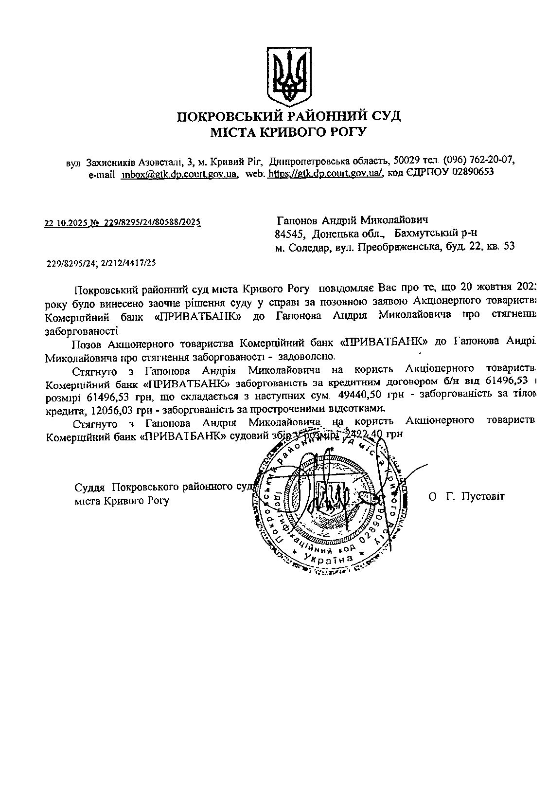 Повідомлення про розгляд цивільної справи за позовом АТ КБ "ПриватБанк" до Гапонова Андрія Миколайовича про стягнення заборгованості