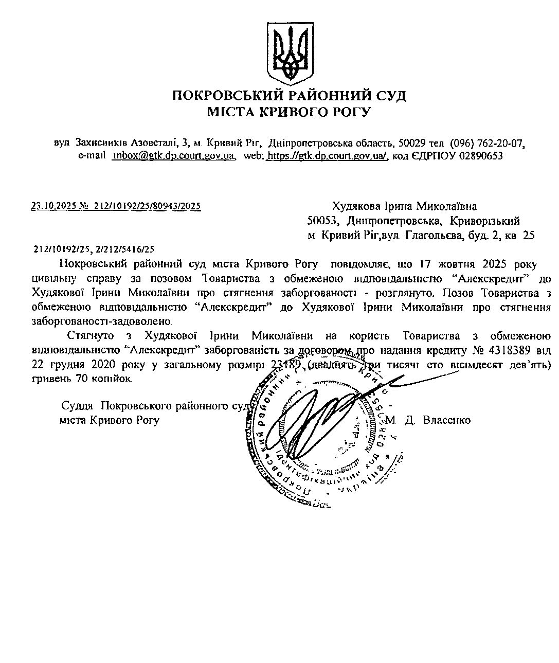 Повідомлення про розгляд цивільної справи за позовом ТОВ "Алекскредит" до Худякової Ірини Миколаївни про стягнення заборгованості за кредитним договором