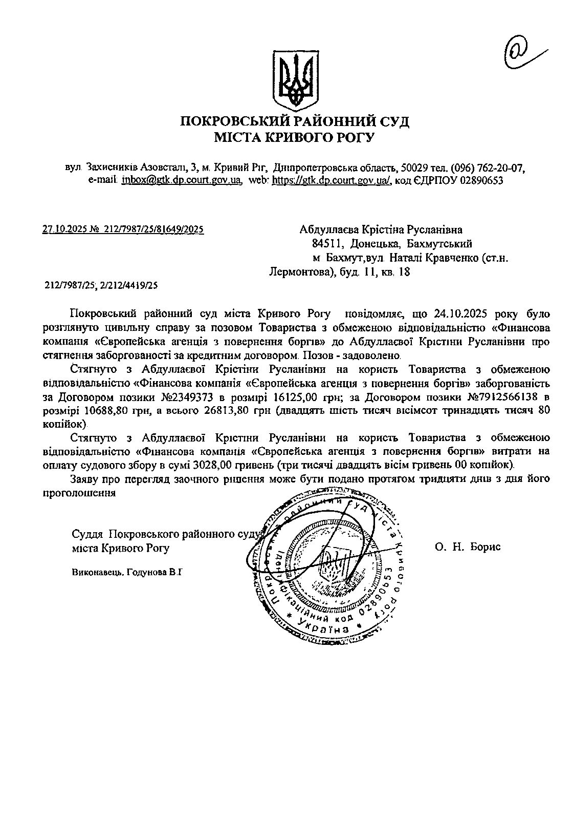 Повідомлення про розгляд цивільної справи за позовом ТОВ з обмеженою відповідальністю "Фінансова компанія "Європейська агенція з повернення боргів"" до Абдулаєвої Крістіни Русланівни про стягнення заборгованості за кредитним договором