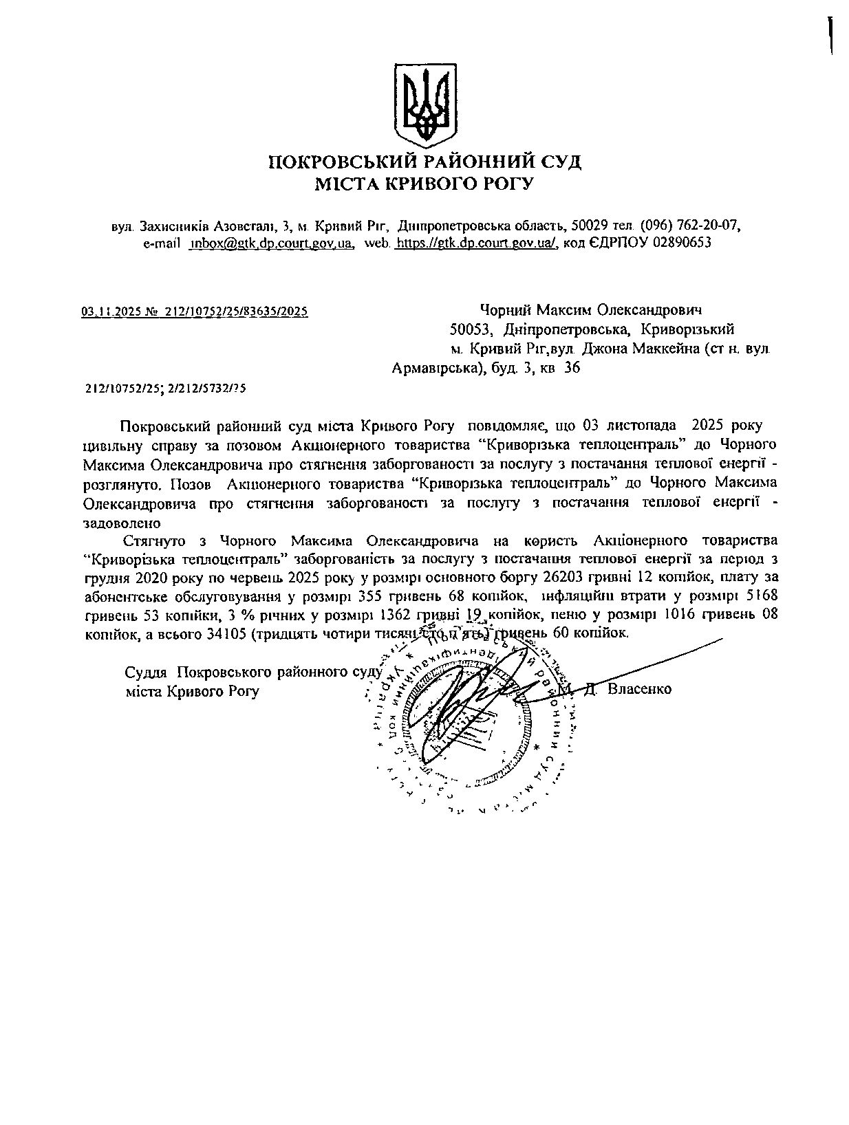 Повідомлення про розгляд цивільної справи за позовом Акціонерного товариства "Криворізька теплоцентраль" до Чорного Максима Олександровича про стягнення заборгованості за постачання теплової енергії