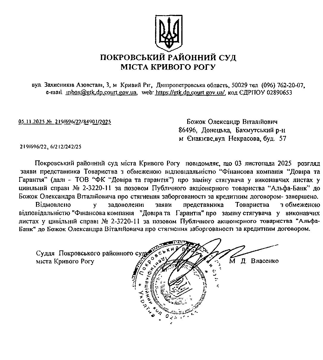 Повідомлення про розгляд цивільної справи за позовом ТОВ з обмеженою відповідальністю "Довіра та гарентія " до Божка Олександра Віталійовича про стягнення заборгованості за кредитним договором