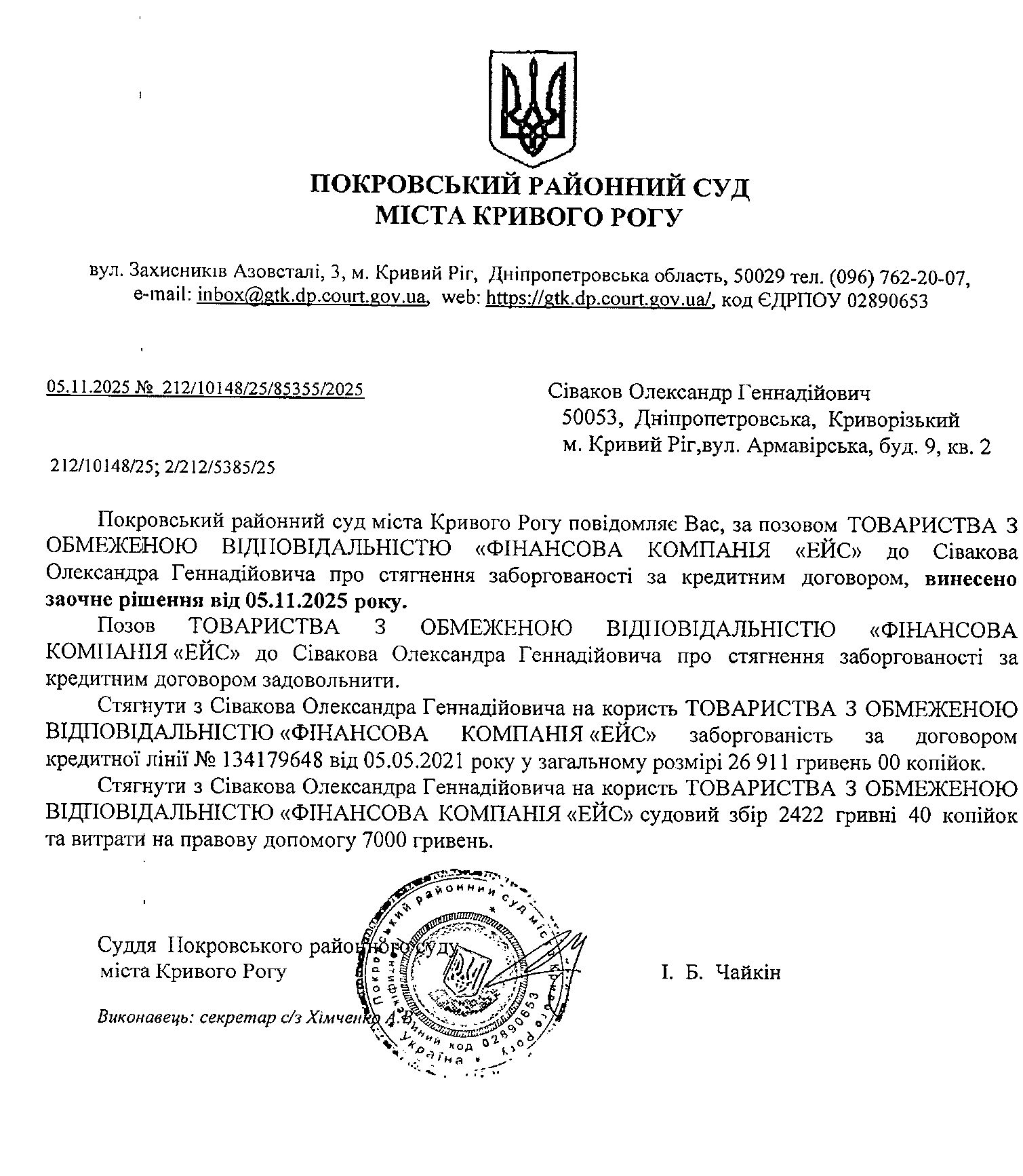 Повідомлення про розгляд цивільної справи за позовом ТОВ з обмеженою відповідальністю "Фінансова компанія "ЕЙС" до Сівакова Олександра Геннадійовича про стягнення заборгованості за кредитним договором
