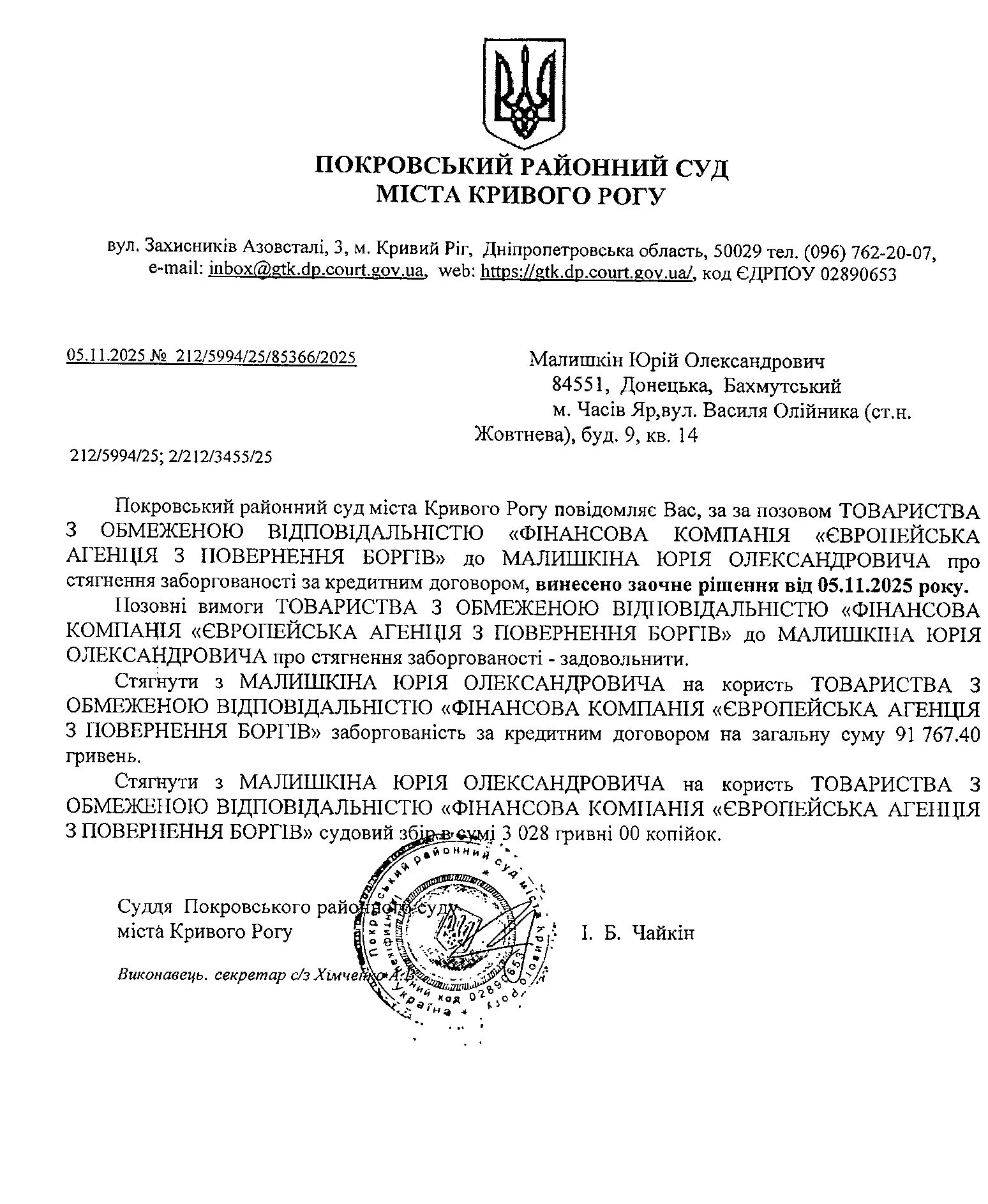 Повідомлення про розгляд цивільної справи за позовом ТОВ з обмеженою відповідальністю "Фінансова компанія "Європейська агенція з повернення боргів"" до Малишкіна Юрія Олександровича про стягнення заборгованості за кредитним договором