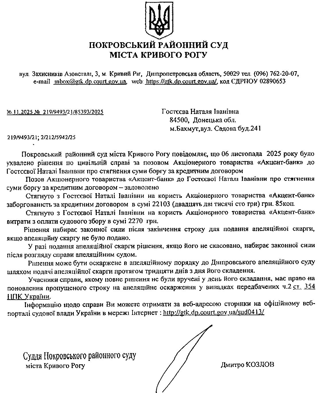 Повідомлення про розгляд цивільної справи за позовом АТ "Акцент-Банк" до Гостєєвої Наталі Іванівни про стягнення заборгованості