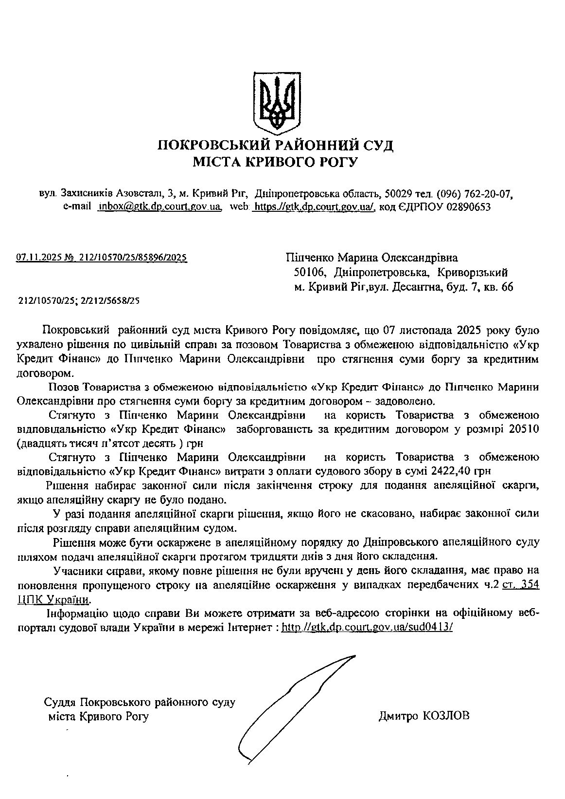 Повідомлення про розгляд цивільної справи за позовом ТОВ з обмеженою відповідальністю "УкрКредитФінанс" до Пипченко Марини Олександрівни про стягнення заборгованості за кредитним договором