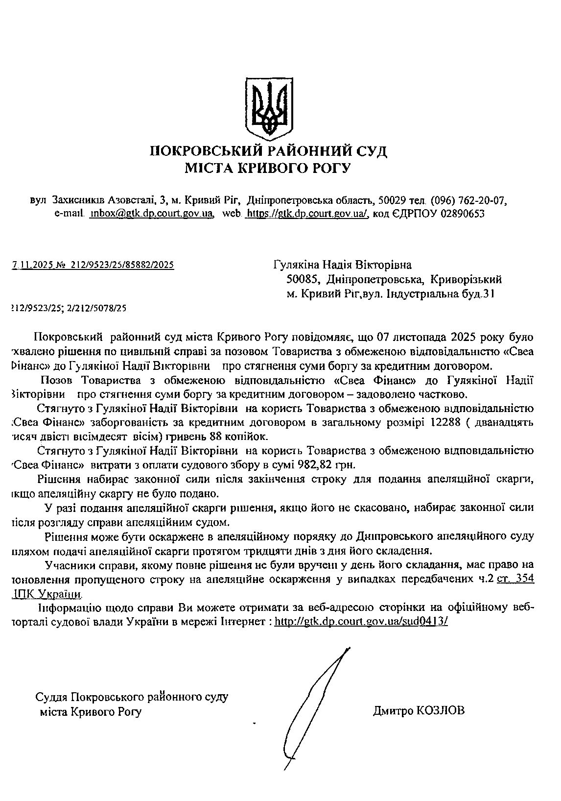 Повідомлення про розгляд цивільної справи за позовом ТОВ з обмеженою відповідальністю "Свеа Фінанс" до Гулякіної Надії Вікторівни про стягнення заборгованості за кредитним договором