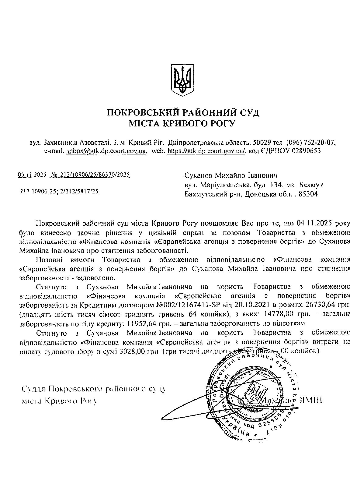 Повідомлення про розгляд цивільної справи за позовом ТОВ з обмеженою відповідальністю "Фінансова компанія "Європейська агенція з повернення боргів"" до Суханова Михайла Івановича про стягнення заборгованості за кредитним договором