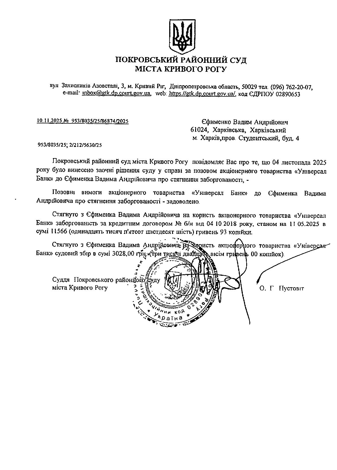 Повідомлення про розгляд цивільної справи за позовом Акціонерного товариства "Універсал банк" до Єфименка Вадима Андрійовича про стягнення боргу за кредитним договором