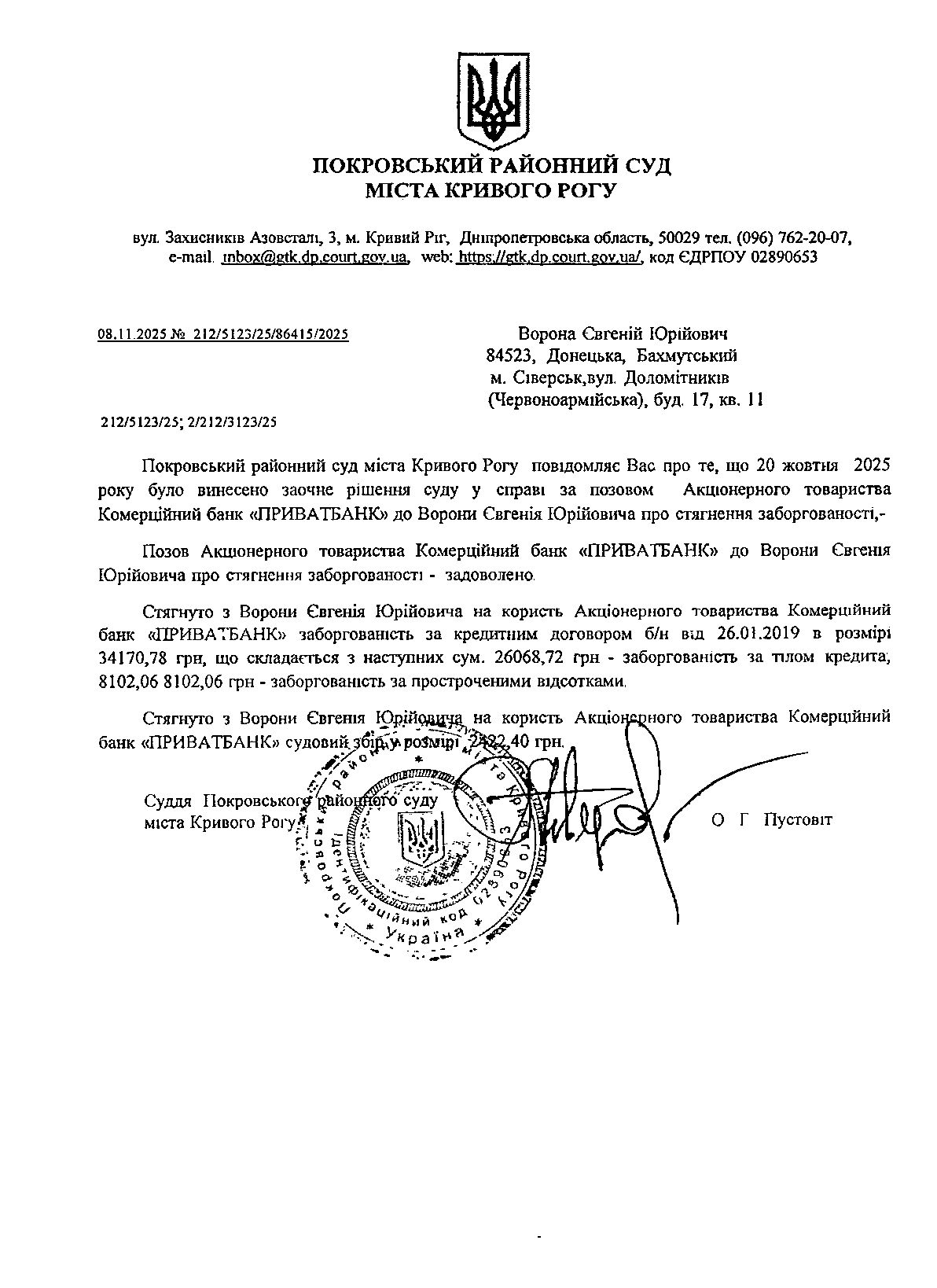 Повідомлення про розгляд цивільної справи за позовом АТ КБ "ПриватБанк" до Ворони Євгенія Юрійовича про стягнення заборгованості