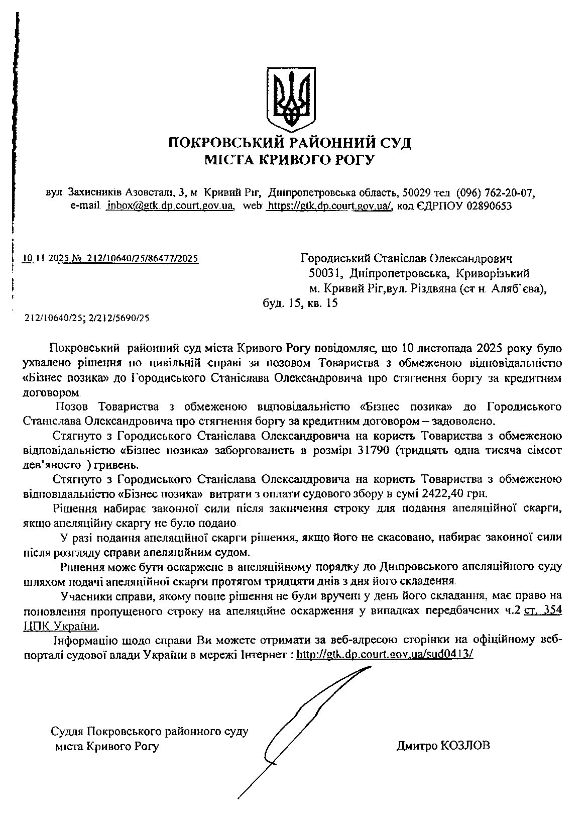 Повідомлення про розгляд цивільної справи за позовом ТОВ з обмеженою відповідальністю "Бізнес позика" до Городинського Станіслава Олександровича про стягнення заборгованості за кредитним договором