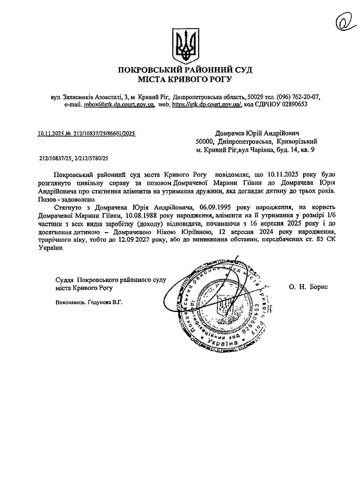 Повідомлення про розгляд цивільної справи за позовом Домрачевої Марини Гіївни до Домрачева Юрія Андрійоіича на утримання аліментів