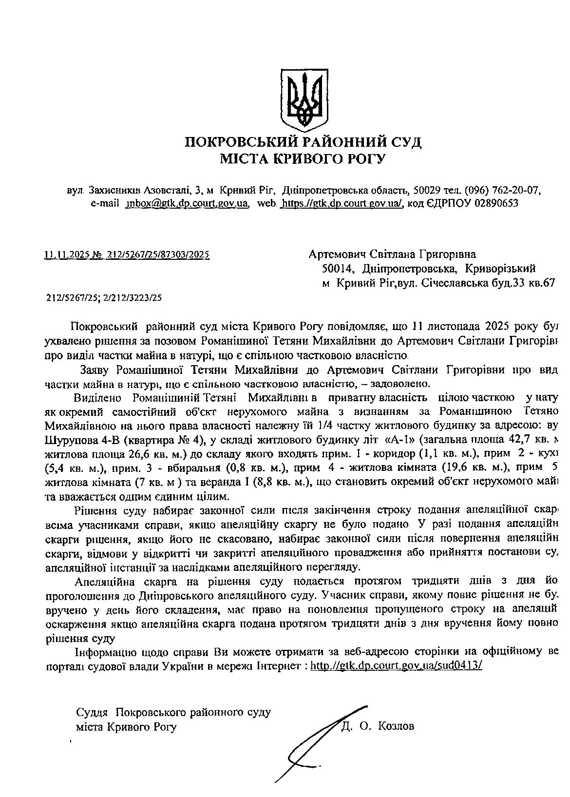 Повідомлення про розгляд цивільної справи за позовом Романішиної Тетяни Михайлівни до Артемович Світлани Григорівни про виділ частки нерухомомго майна