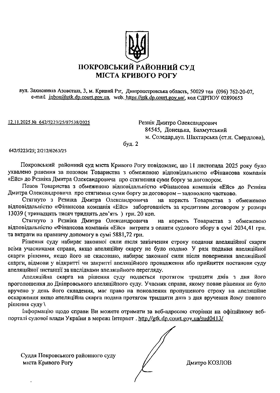 Повідомлення про розгляд цивільної справи за позовом ТОВ з обмеженою відповідальністю "Фінансова компанія "ЕЙС" до Рєзніка Дмитра Олександровича про стягнення заборгованості за кредитним договором
