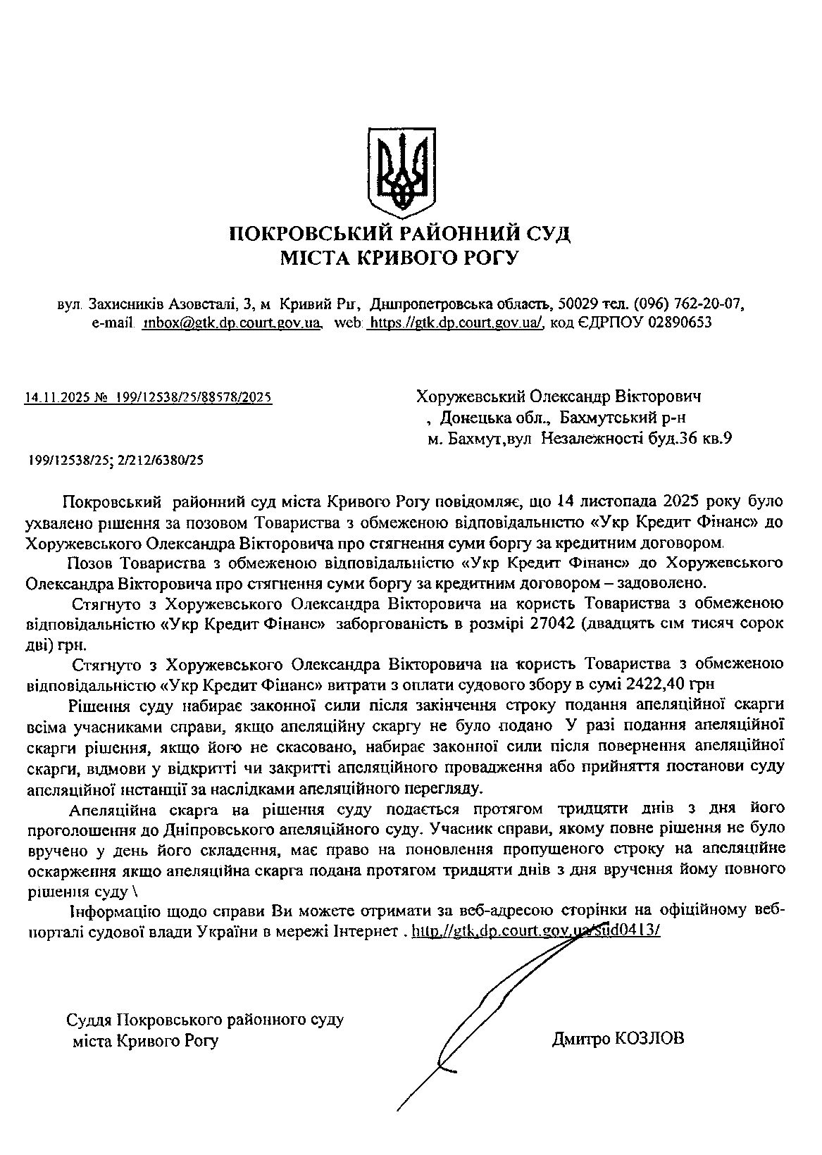 Повідомлення про розгляд цивільної справи за позовом ТОВ з обмеженою відповідальністю "УкрКредитФінанс" до Хоружевського Олександра Вікторовича про стягнення заборгованості за кредитним договором