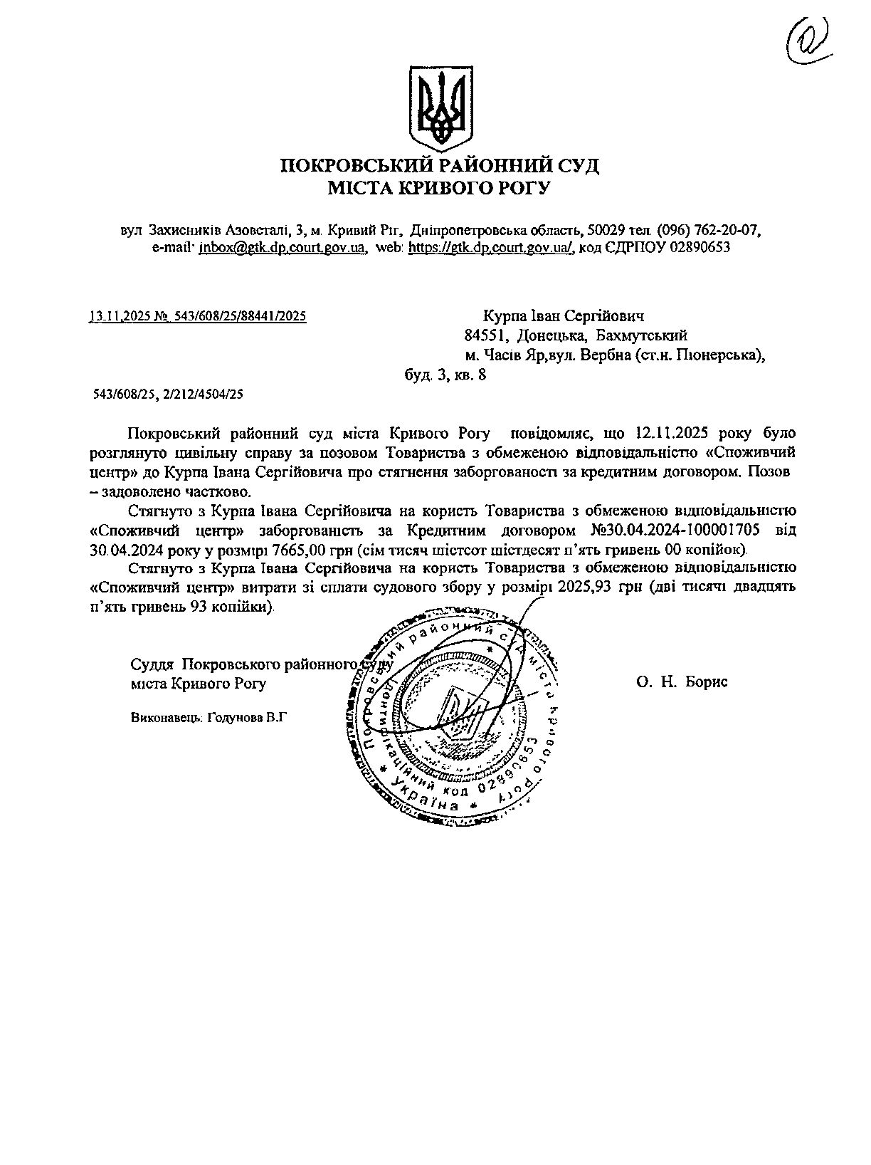 Повідомлення про розгляд цивільної справи за позовом ТОВ з обмеженою відповідальністю "Споживчий Центр" до Курпи Івана Сергійовича про стягнення заборгованості за кредитним договором