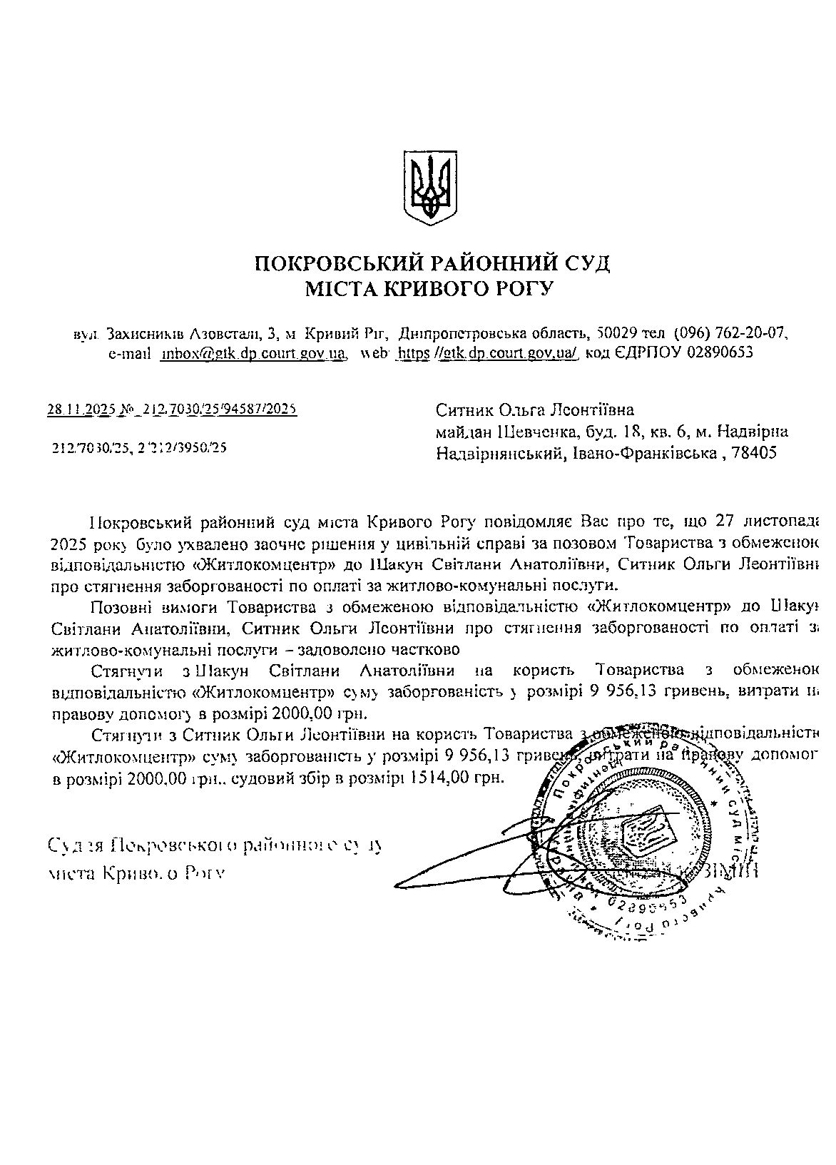 Повідомлення про розгляд цивільної справи за позовом ТОВ з обмеженою відповідальністю "Житлокомцентр" до Ситник Ольги Леонтіївни про стягнення заборгованості за по оплаті за житлово-комунальні послуги