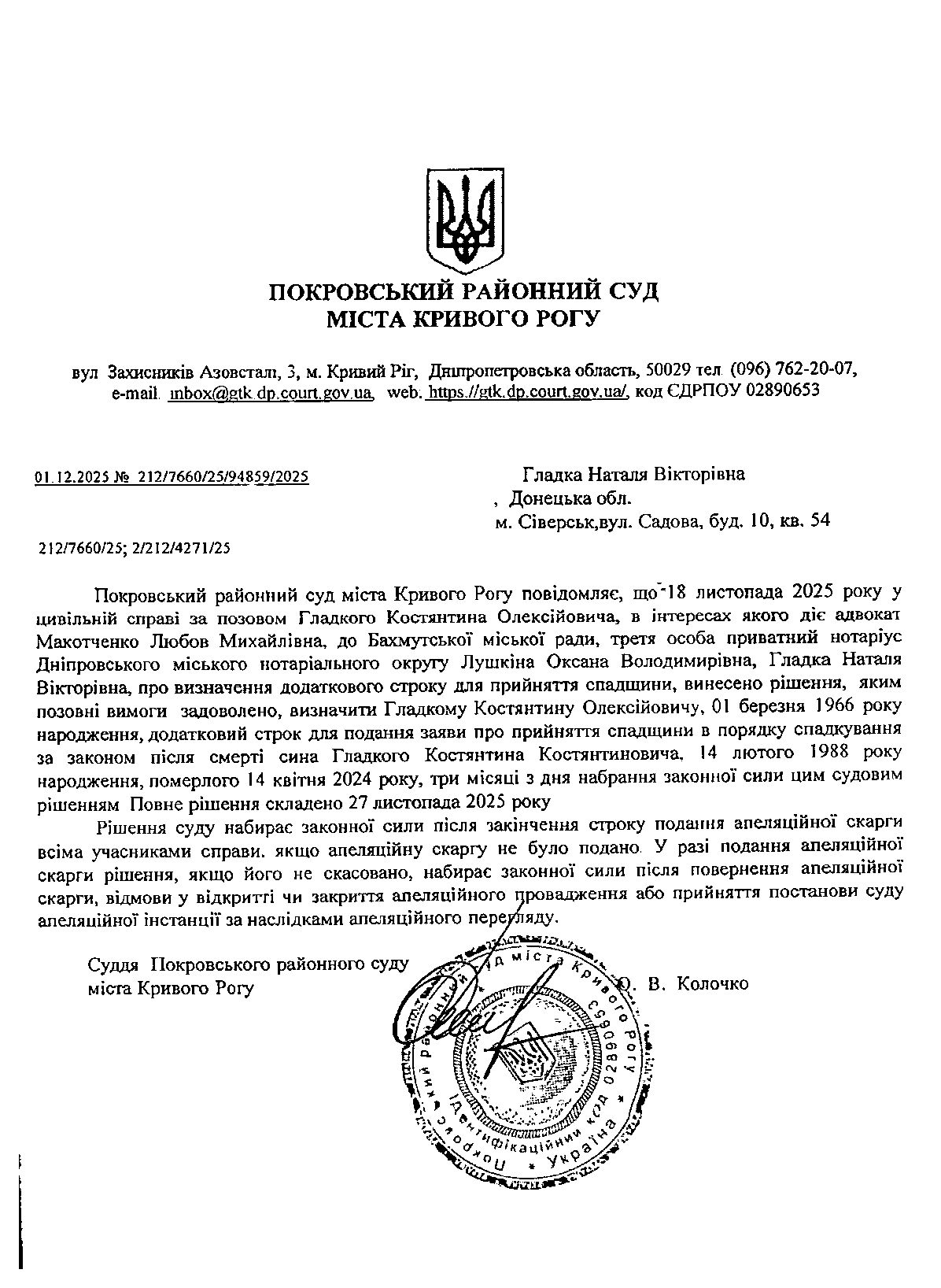 Повідомлення про розгляд цивільної справи за позовом Гладкого Костянтина Олексійовича до Гладкої Наталі Вікторівни про визначення додаткового строку для прийняття спадщини