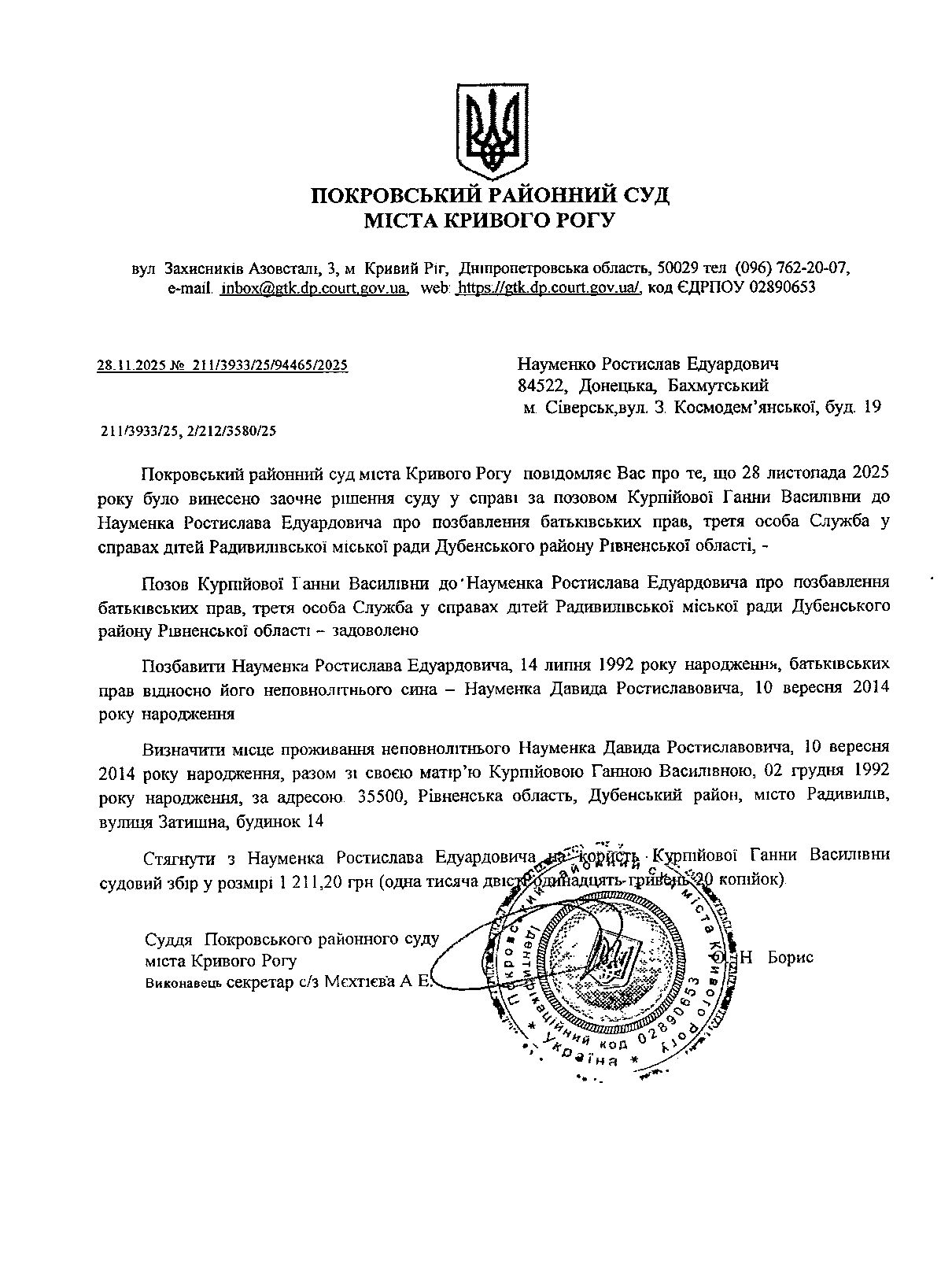 Повідомлення про розгляд цивільної справи за позовом Курпійової Ганни Василівни до Науменка Ростислава Едуаодовича про позбавлення батьківських прав