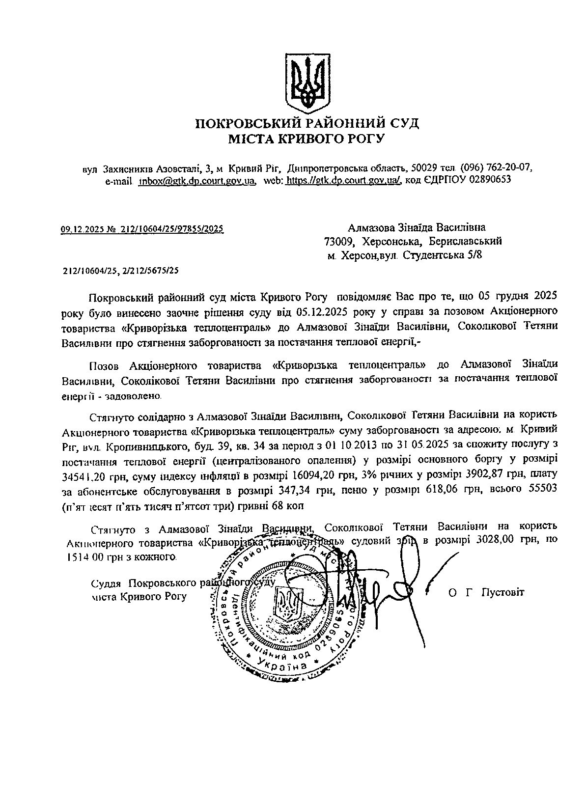Повідомлення про розгляд цивільної справи за 'позовом Акціонерного товариства "Криворізька теплоцентраль" до Алмазової Зінаїди Василівни про стягнення заборгованості за постачання теплової енергії