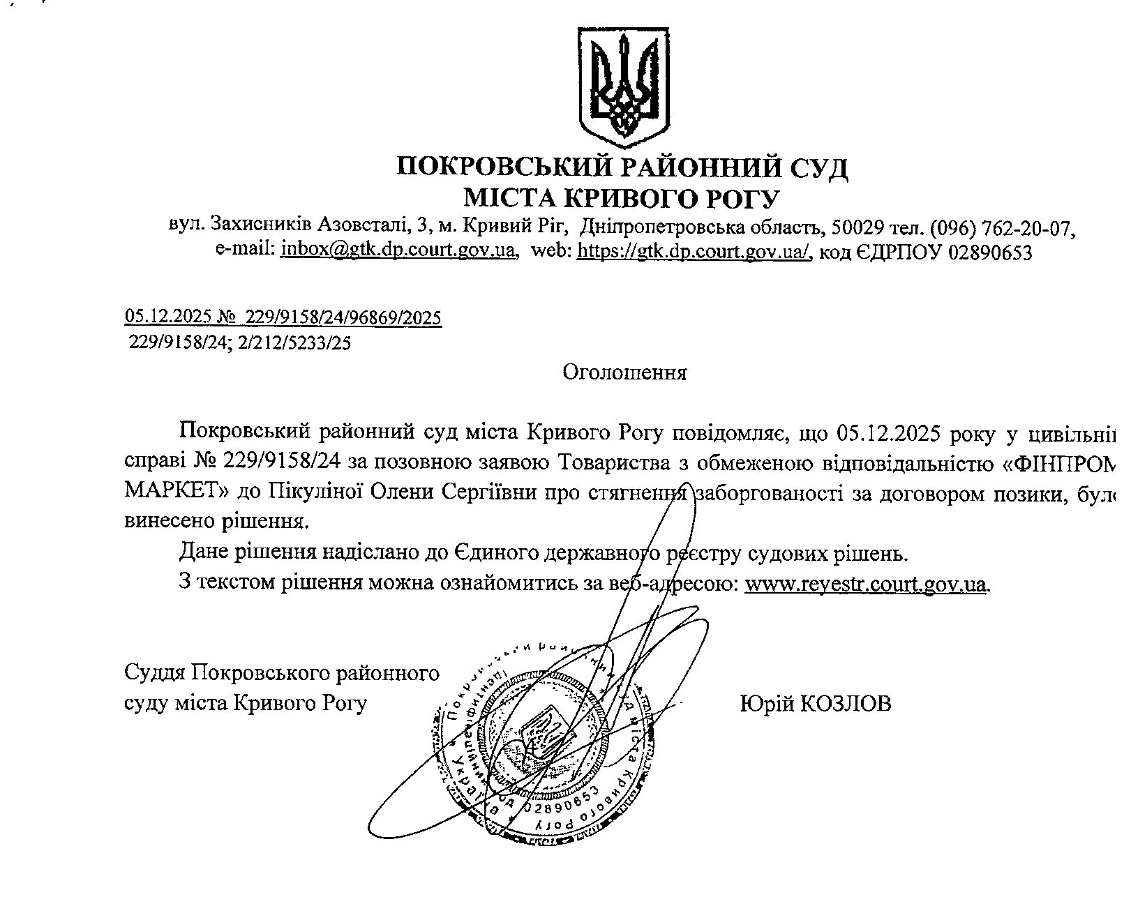 Повідомлення про розгляд цивільної справи за позовом ТОВ з обмеженою відповідальністю "ФІНПРОМ МАРКЕТ" до Пікуліної Олени Сергіївни про стягнення заборгованості за кредитним договором