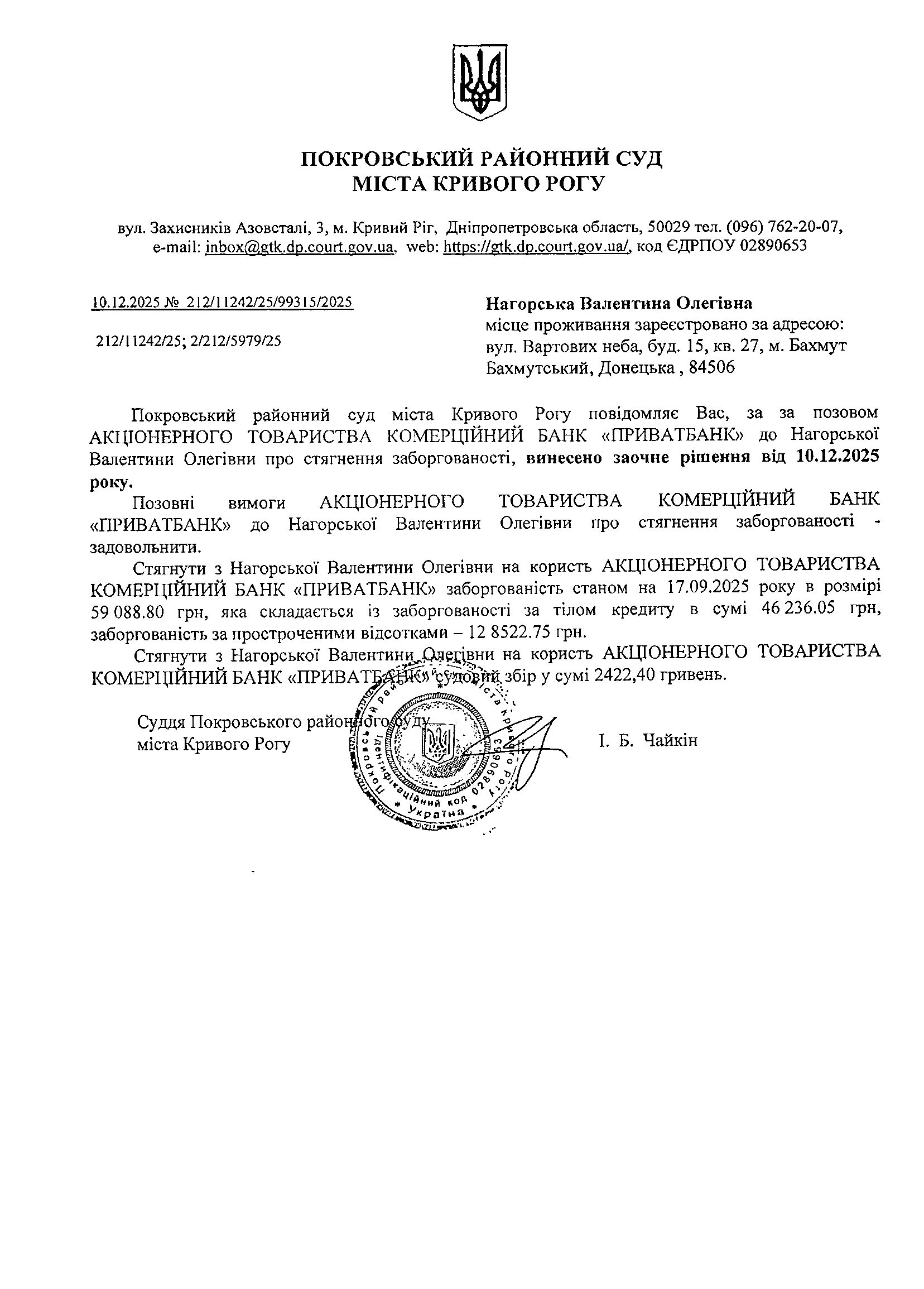 Повідомлення про розгляд цивільної справи за позовом АТ КБ "ПриватБанк" до Нагорської Валентини Олегівни про стягнення заборгованості