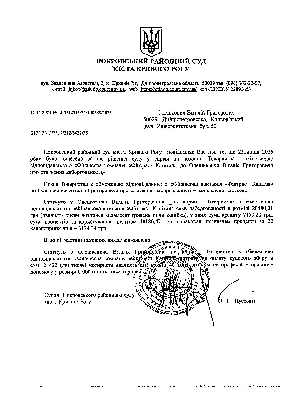 Повідомлення про розгляд цивільної справи за позовом ТОВ з обмеженою відповідальністю "Фінансова компанія "Фінтраст Капітал" до Олешкевича Віталія Григоровича про стягнення заборгованості за кредитним договором