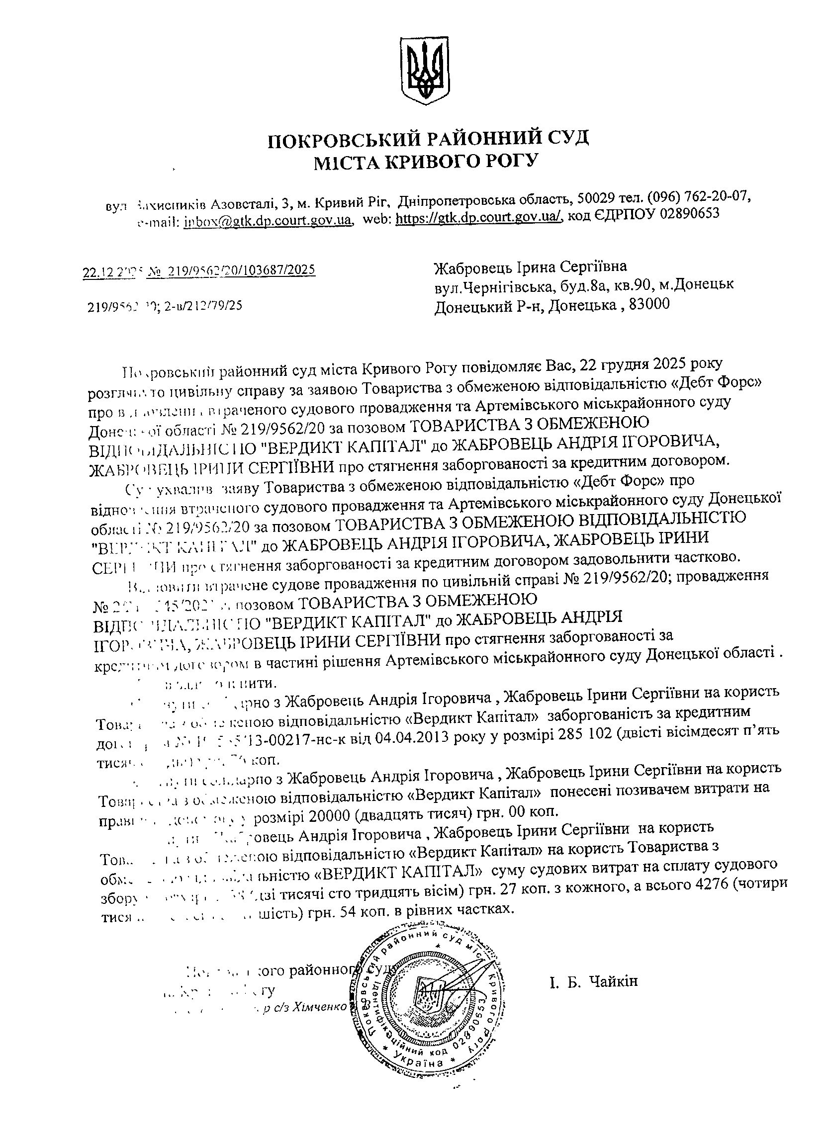 Повідомлення про розгляд цивільної справи про відновлення втраченого судового провадження відносно Жабровець Ірини Сергіївни