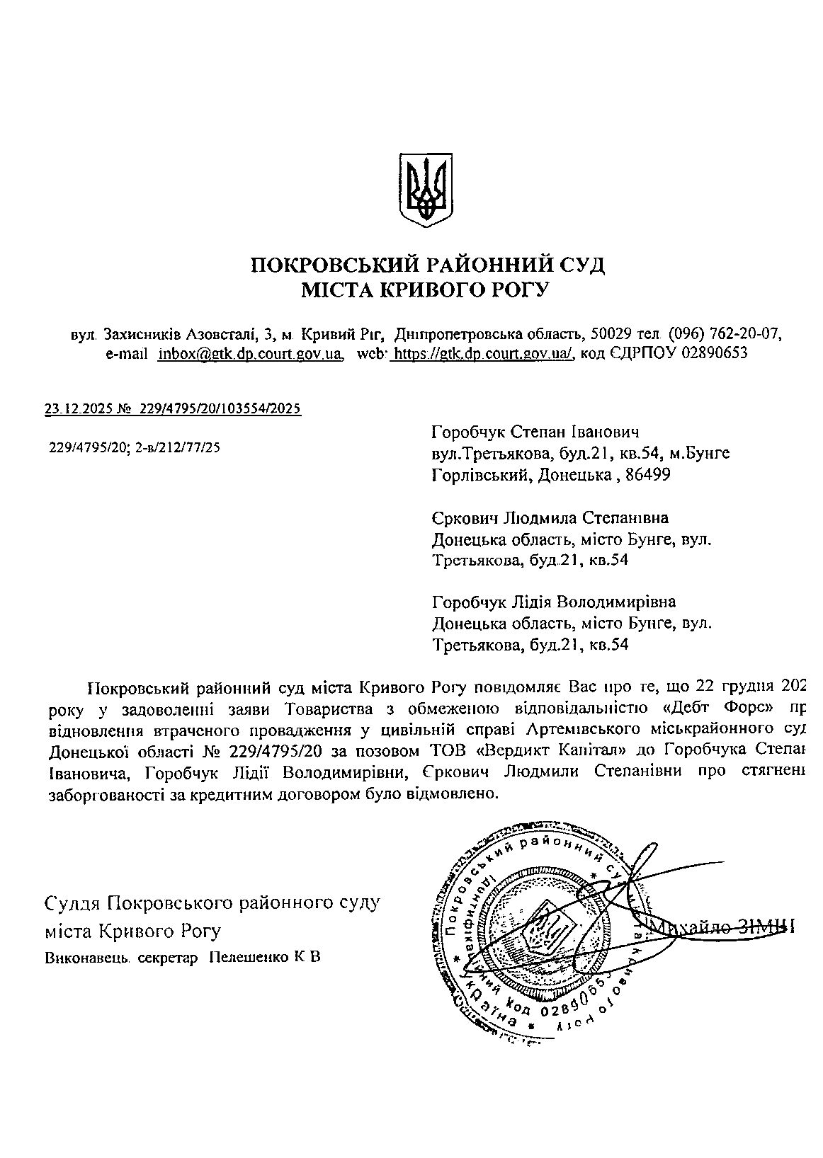 Повідомлення про розгляд цивільної справи за позовом ТОВ з обмеженою відповідальністю "Дебт Форс" про відновлення втраченого провадження до Горобчука Степана Івановича, Горобчук Лідії Володимирівни, Єркович Людмили Степанівни, про стягнення заборгованос