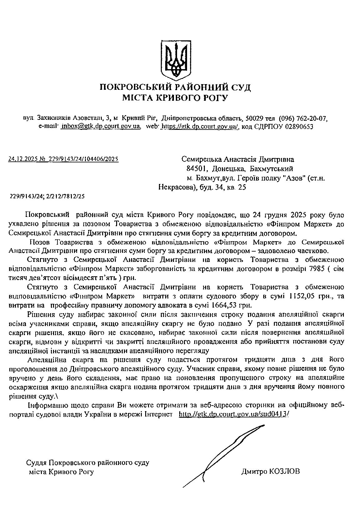 Повідомлення про розгляд цивільної справи за позовом ТОВ з обмеженою відповідальністю "ФІНПРОМ МАРКЕТ" до Семирецької Анастасії Дмитрівни про стягнення заборгованості за кредитним договором