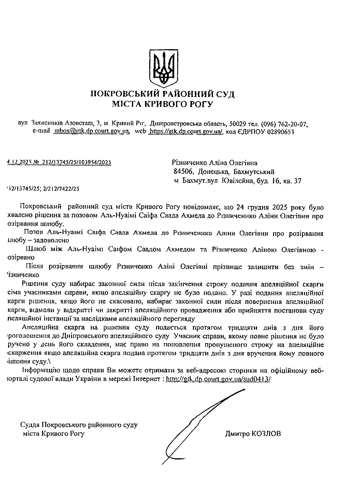 Повідомлення про розгляд цивільної справи за позовом Аль-Нуіамі Саіфа Саада Ахмела до Різниченко Аліни Олегівни про розірвання шлюбу