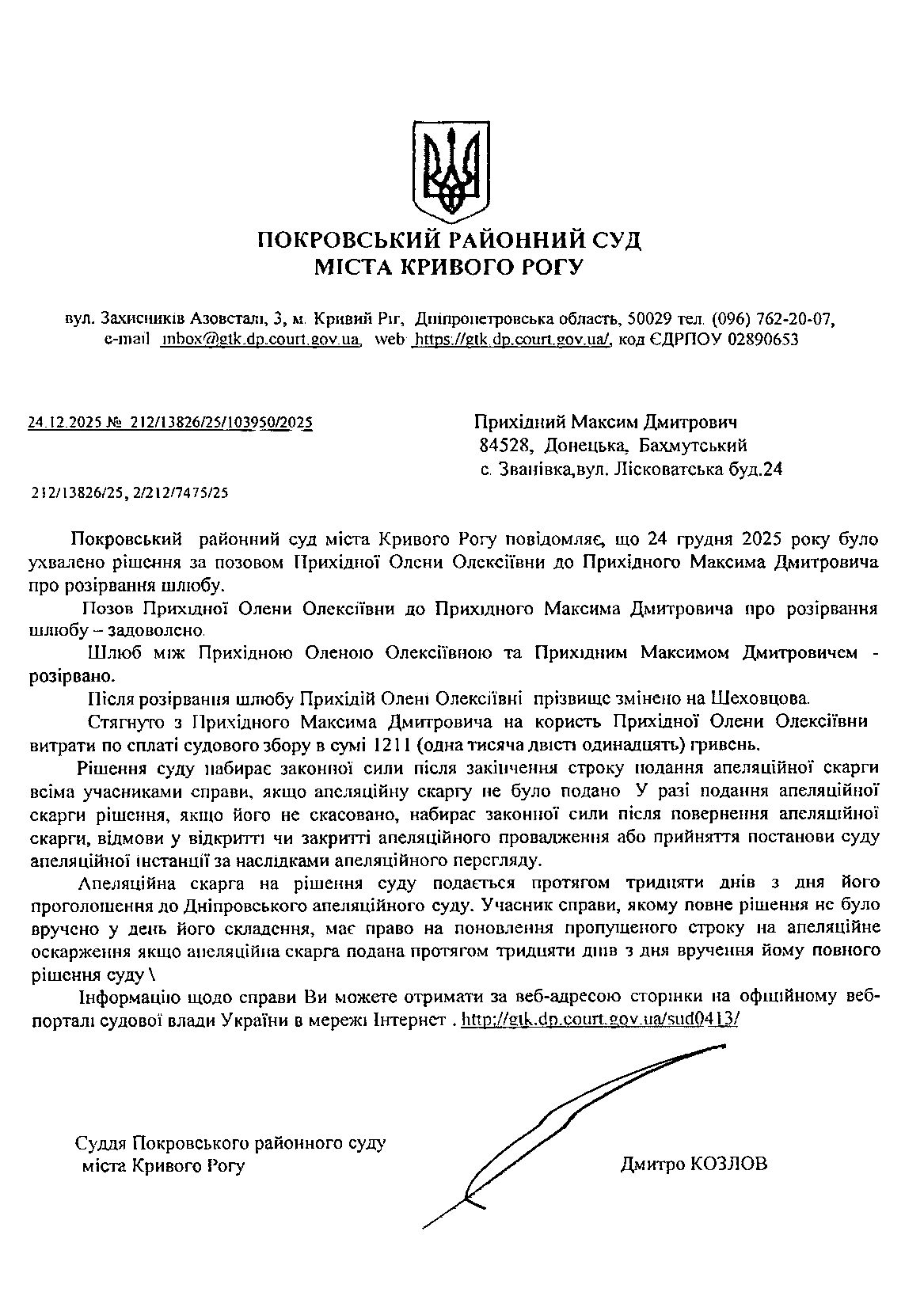 Повідомлення про розгляд цивільної справи за позовом Прихідної Олени Олексіївни до Прихідного Максима Дмитровича про розірвання шлюбу