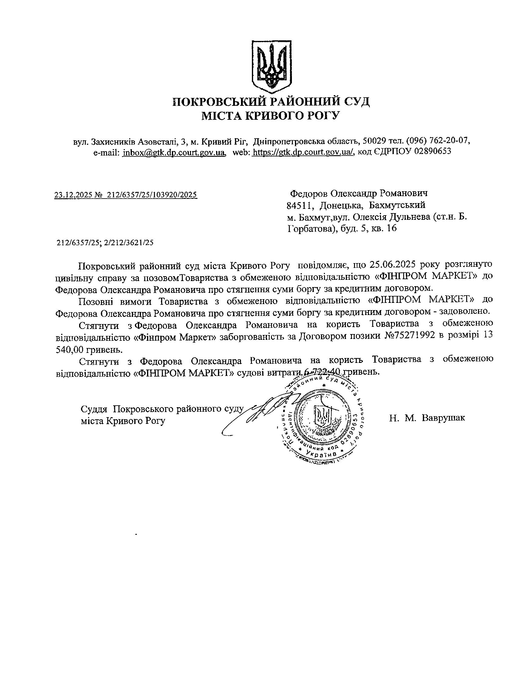 Повідомлення про розгляд цивільної справи за позовом ТОВ з обмеженою відповідальністю "ФІНПРОМ МАРКЕТ" до Федорова Олександра Романовича про стягнення заборгованості за кредитним договором