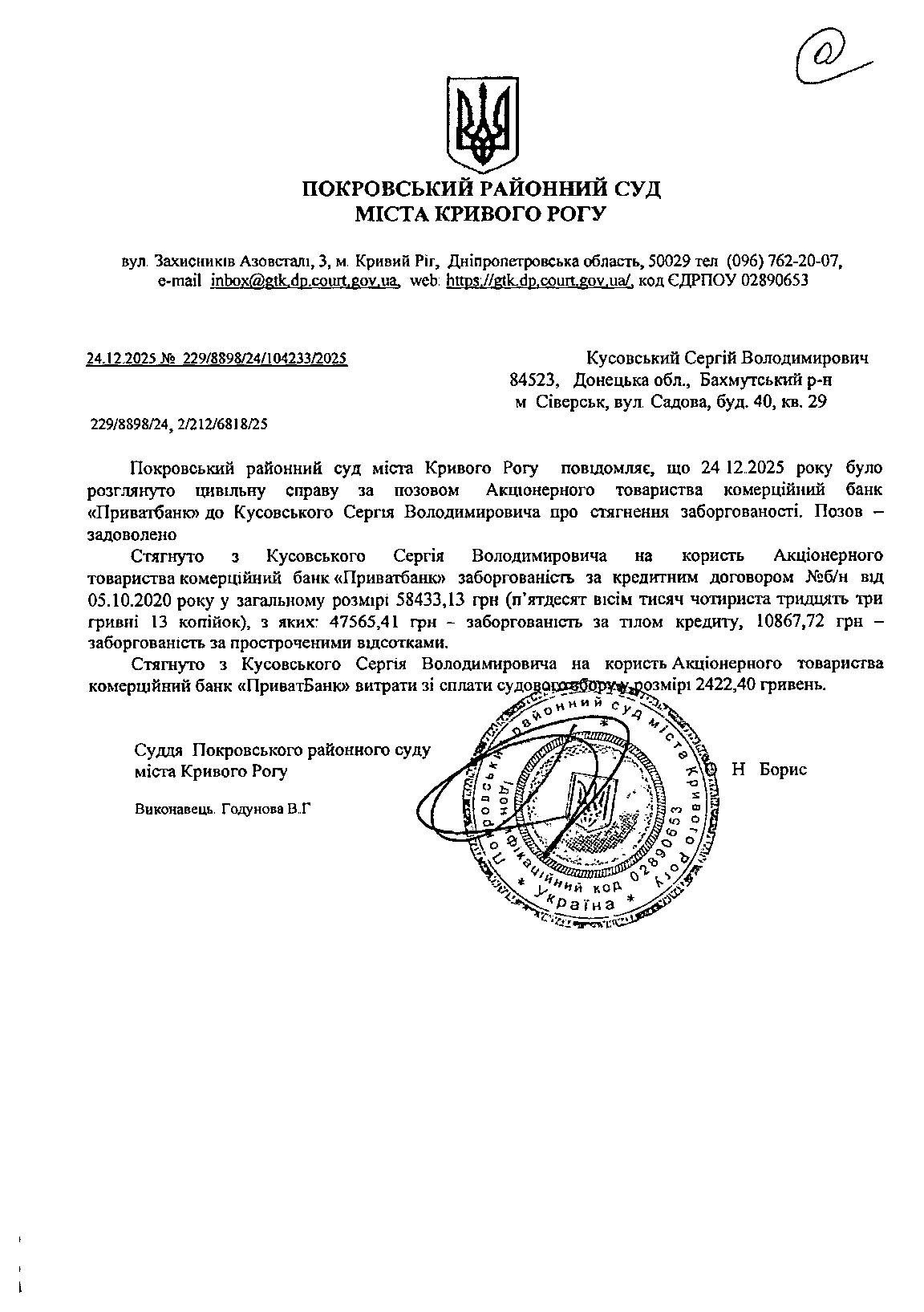 Повідомлення про розгляд цивільної справи за позовом АТ КБ "ПриватБанк" до Кусовського Сергія Володимировича про стягнення заборгованості