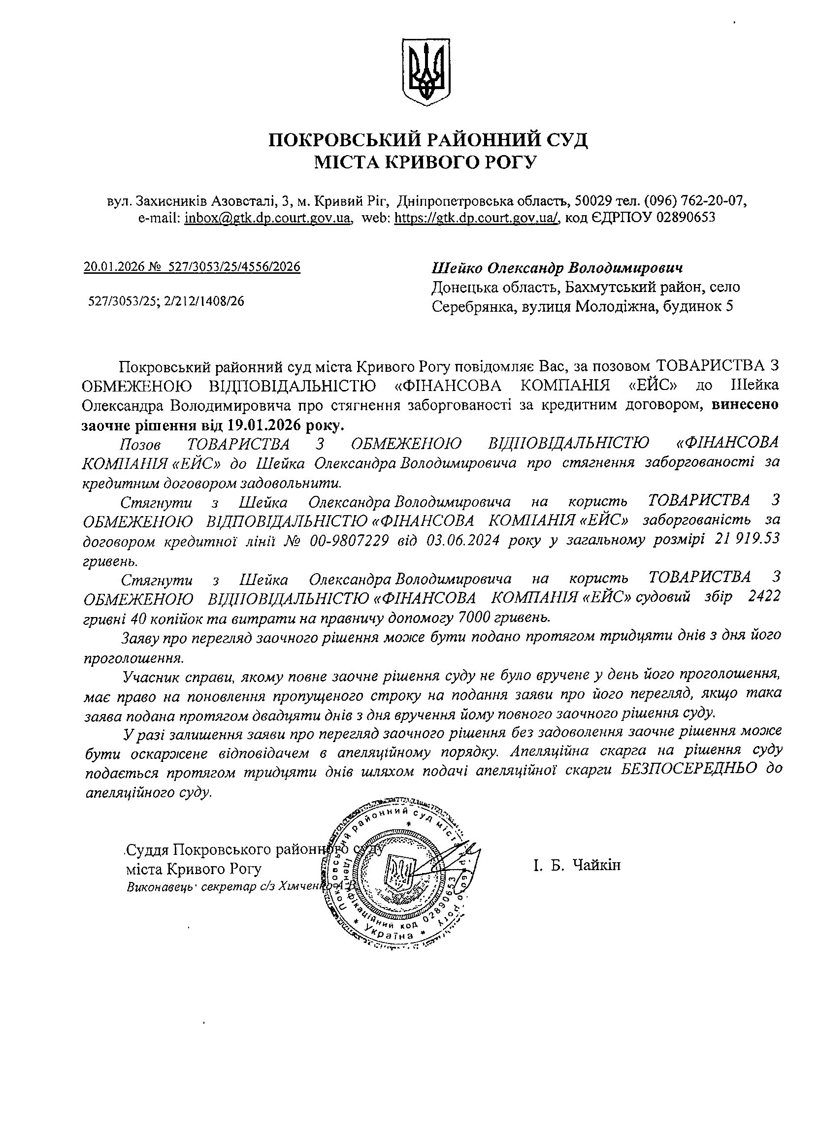 Повідомлення про розгляд цивільної справи за позовом ТОВ з обмеженою відповідальністю "Фінансова компанія "ЕЙС" до Шейка Олександра Володимировича про стягнення заборгованості за кредитним договором