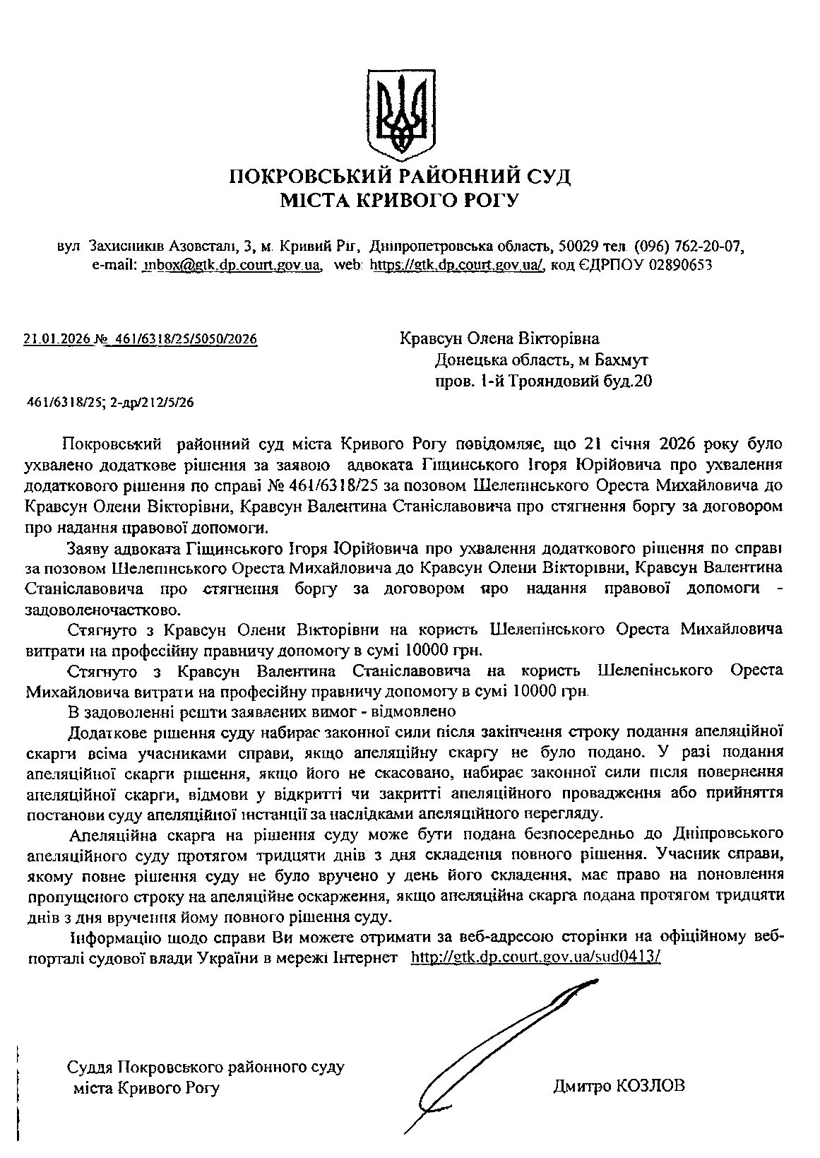 Повідомлення про ухвалення додаткового рішення по справі за позовом Шелепінського Ореста Михайловича до Кравсун Олени Вікторівни