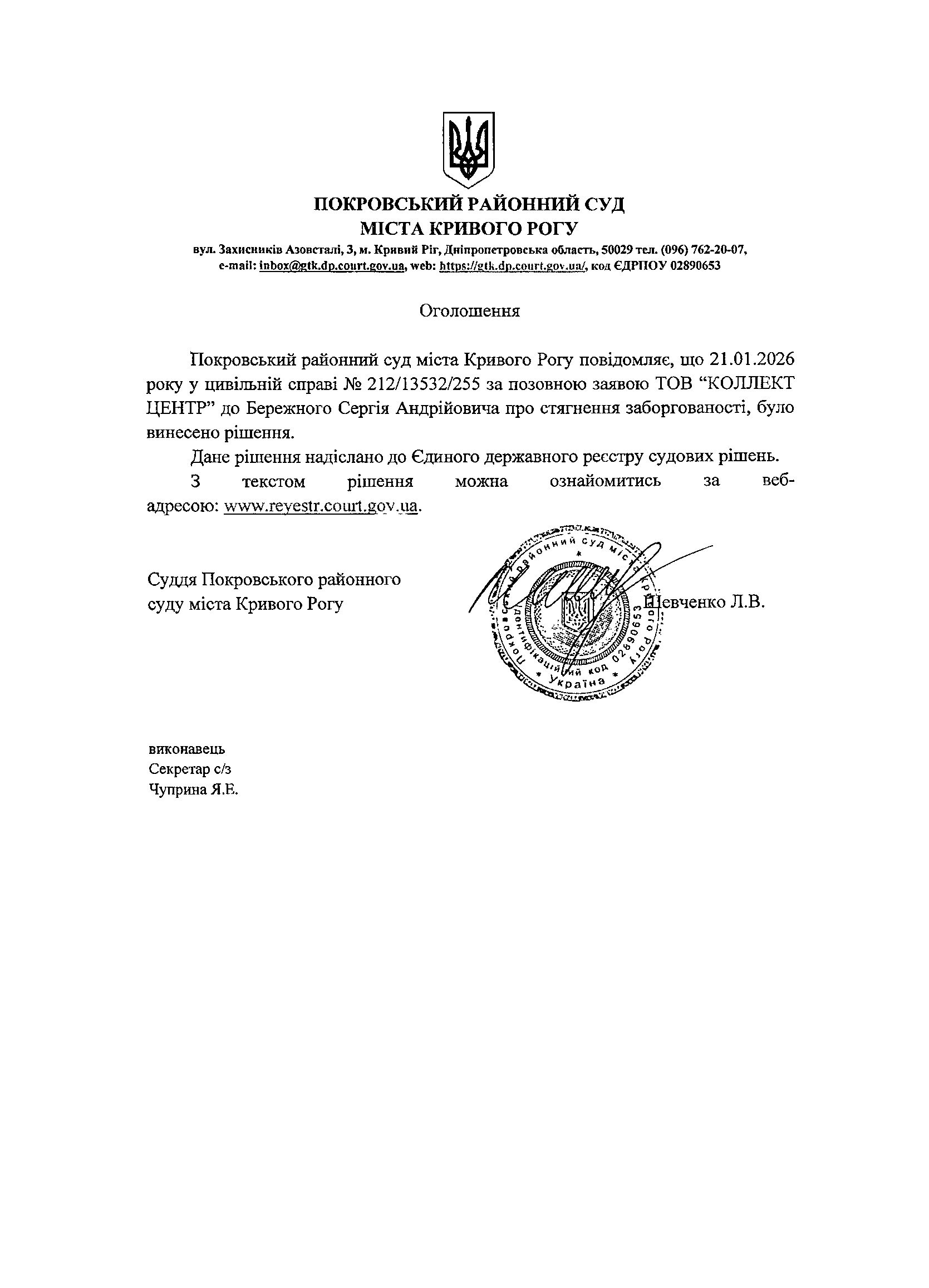 Повідомлення про розгляд цивільної справи за позовом ТОВ з обмеженою відповідальністю "Коллект Центр" до Бережного Сергія Андрійовича про стягнення заборгованості за кредитним договором