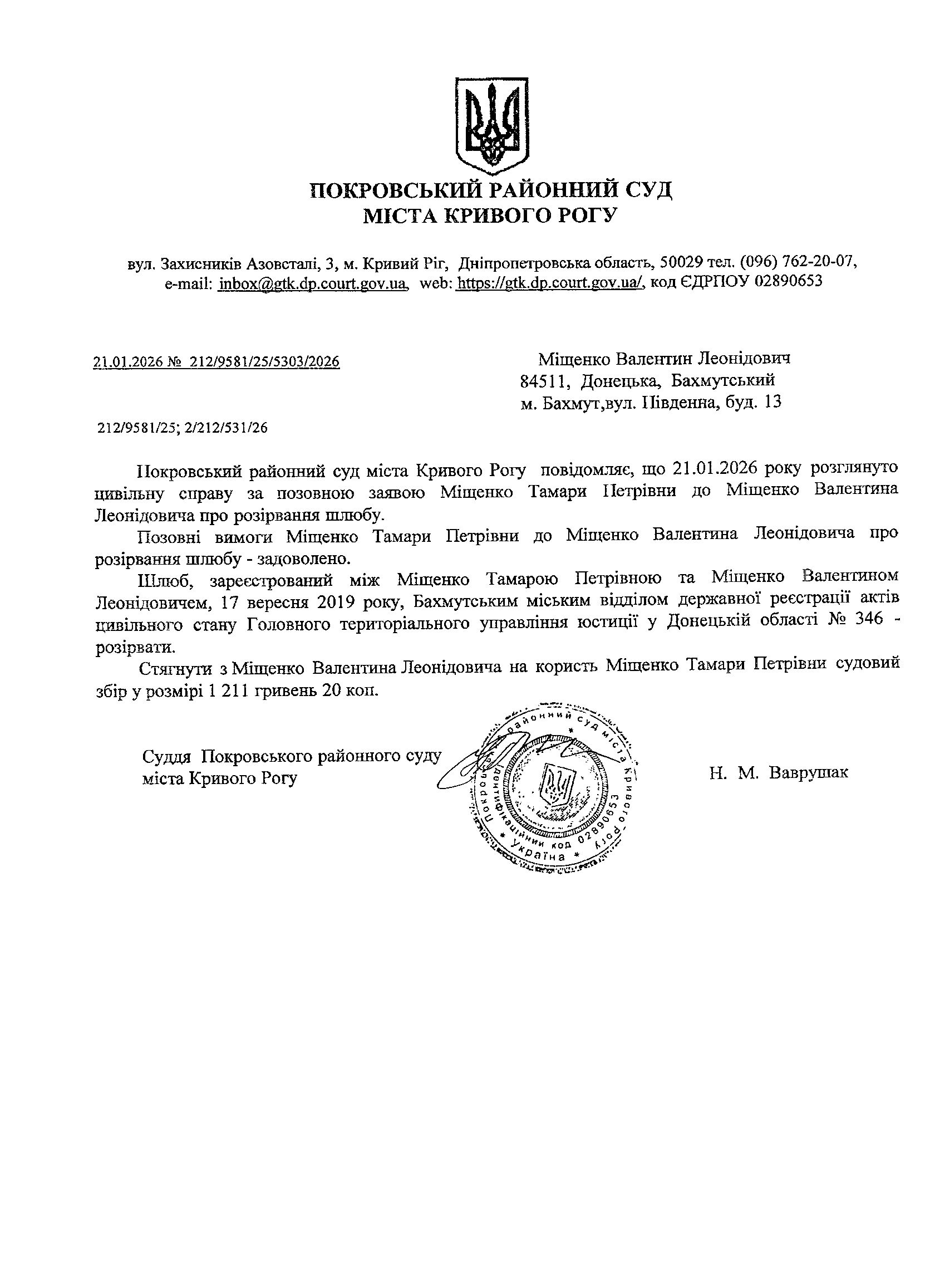 Повідомлення про розгляд цивільної справи за позовом Міщенко Тамари Петрівни до Міщенко Валентина Леонідовича про розірвання шлюбу
