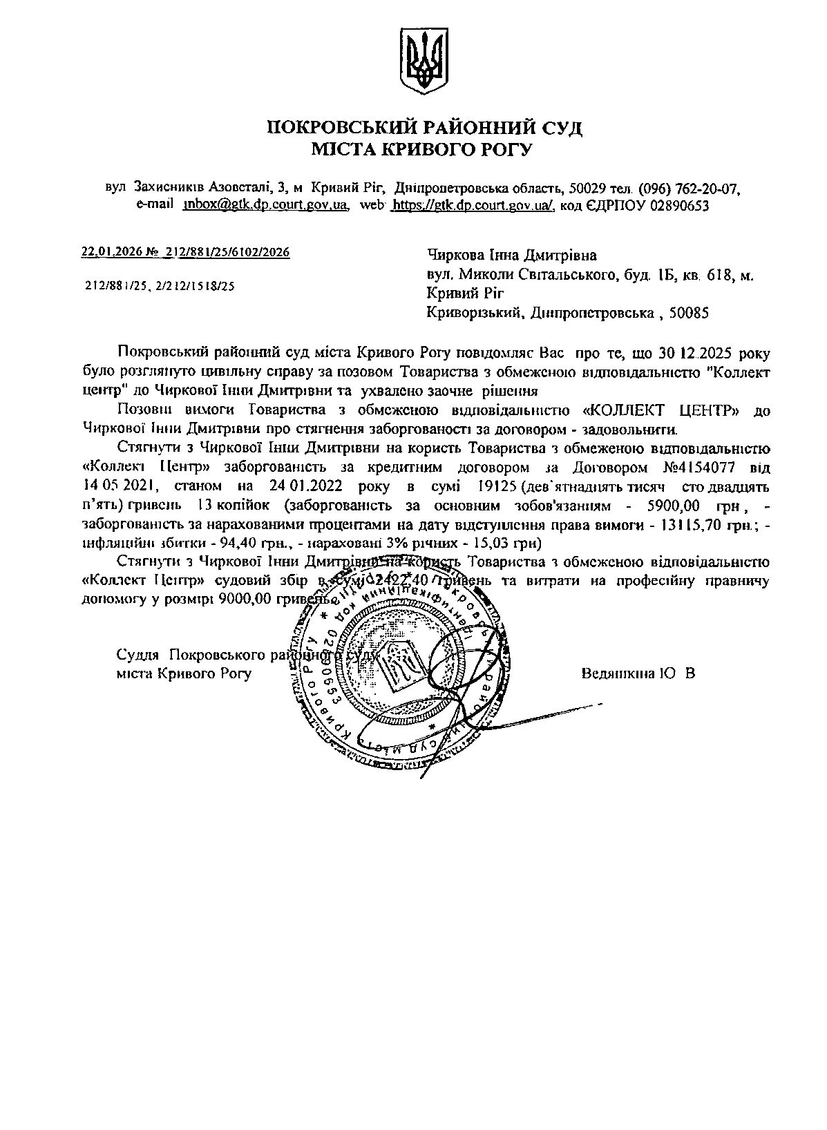 Повідомлення про розгляд цивільної справи за позовом ТОВ з обмеженою відповідальністю "Коллект Центр" до Чиккової Інни Дмитрівни про стягнення заборгованості за кредитним договором