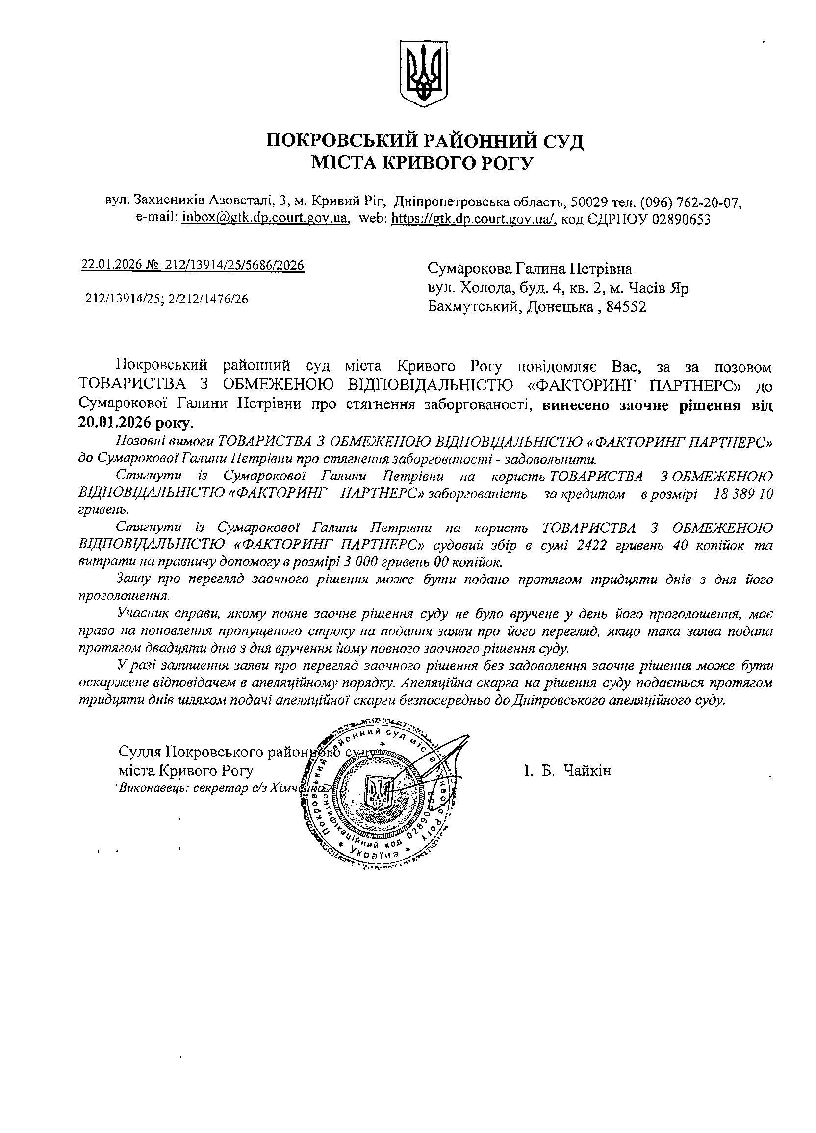 Повідомлення про розгляд цивільної справи за позовом ТОВ з обмеженою відповідальністю "ФАКТОРИНГ ПАРТНЕРС" до Сумарокової Галини Петрівни про стягнення заборгованості за кредитним договором