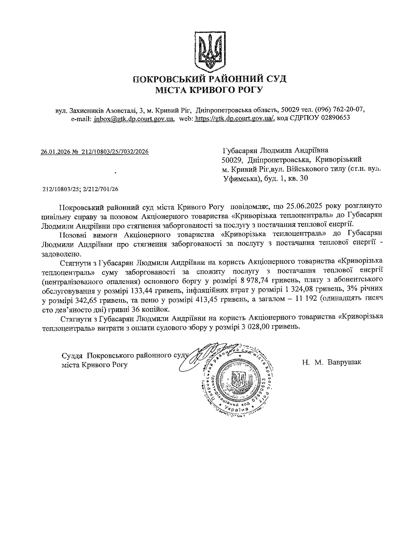 Повідомлення про розгляд цивільної справи за 'позовом Акціонерного товариства "Криворізька теплоцентраль" до Губасарян Людмили Андріївни про стягнення заборгованості за послугу з постачання теплової енергії