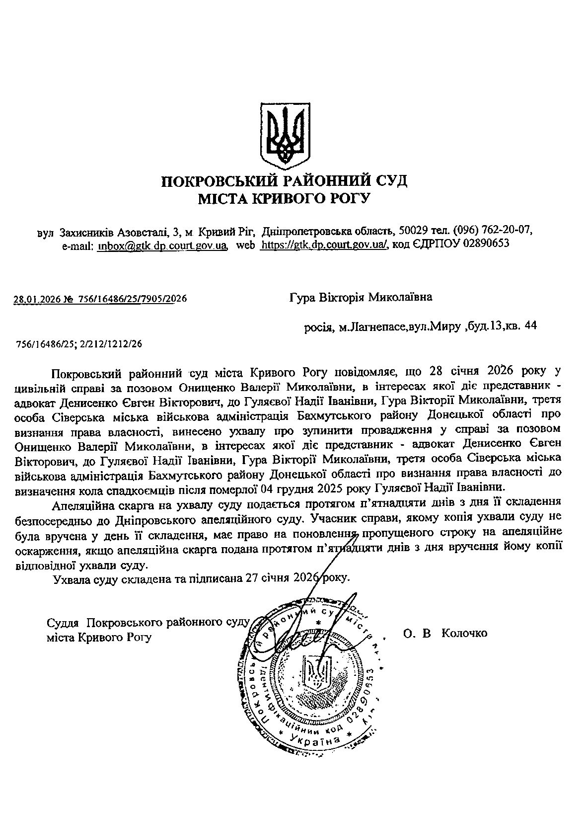 Повідомлення про розгляд цивільної справи за 'позовом Онищенко Валерії Миколаївни про визнання права власності