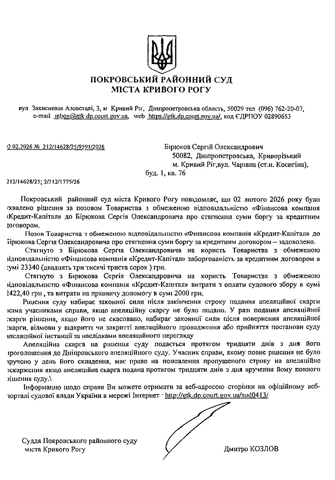 Повідомлення про розгляд цивільної справи за позовом ТОВ з обмеженою відповідальністю "Фінансова компанія "Кредит - Капітал"" до Бірюкова Сергія Олександровича про стягнення заборгованості за кредитним договором