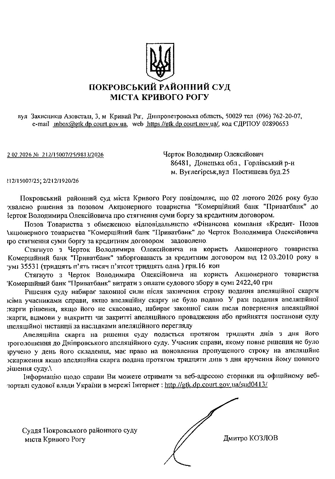 Повідомлення про розгляд цивільної справи за позовом АТ КБ "ПриватБанк" до Чертока Володимира Олексійовича про стягнення заборгованості