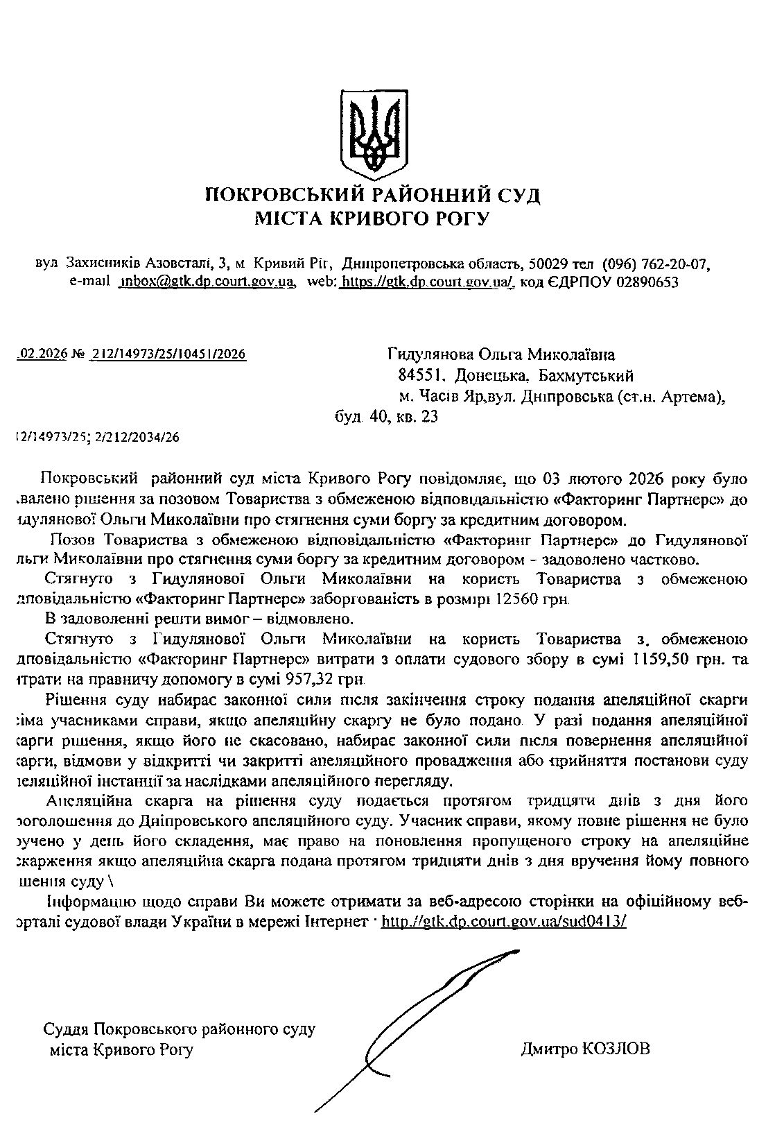 Повідомлення про розгляд цивільної справи за позовом ТОВ з обмеженою відповідальністю "ФАКТОРИНГ ПАРТНЕРС" до Гидулянової Ольги Миколаївни про стягнення заборгованості за кредитним договором