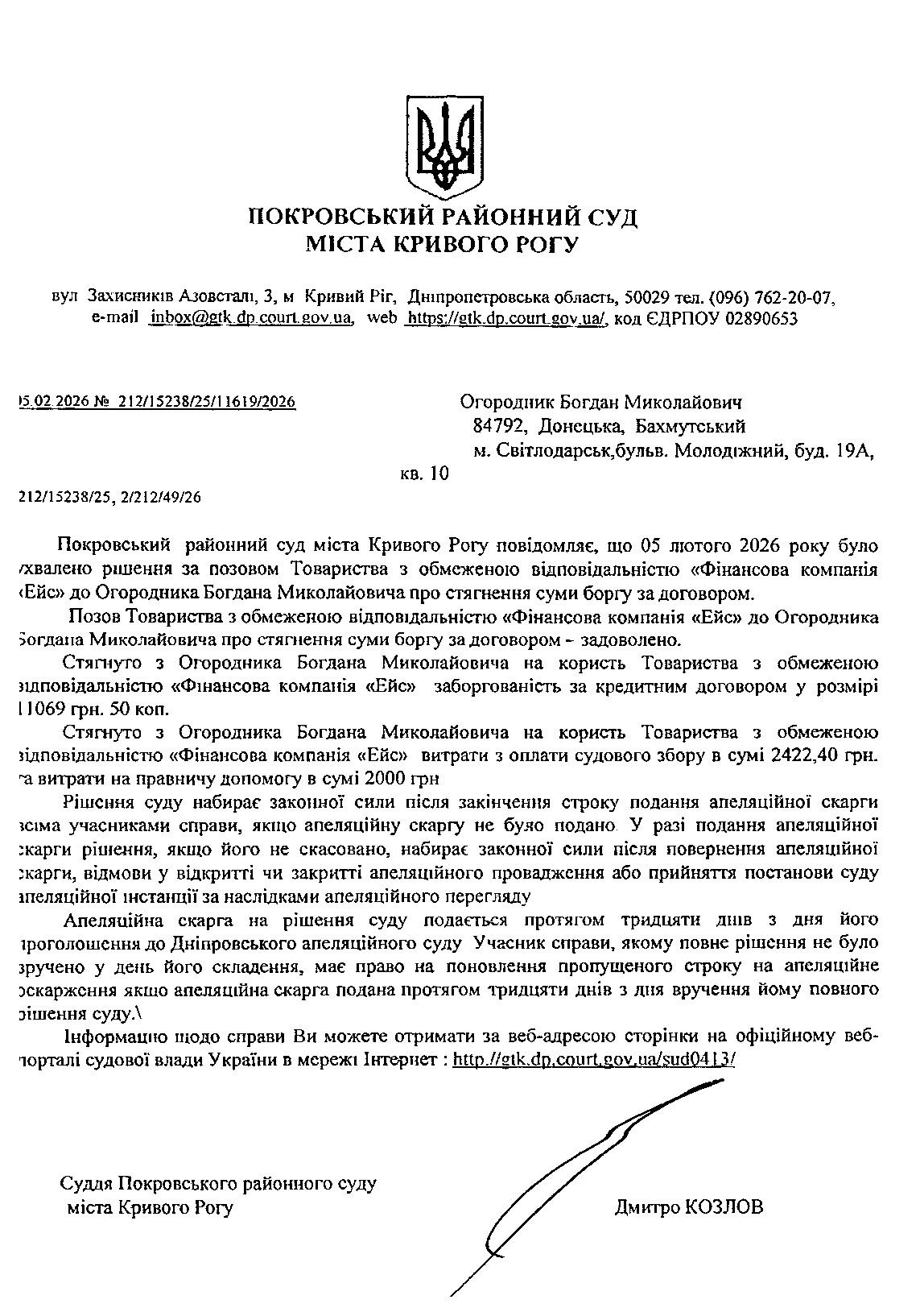 Повідомлення про розгляд цивільної справи за позовом ТОВ з обмеженою відповідальністю "Фінансова компанія "ЕЙС" до Огородника Богдана Ммиколайовича про стягнення заборгованості за кредитним договором