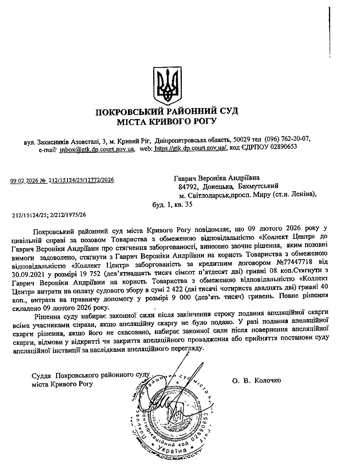 Повідомлення про розгляд цивільної справи за позовом ТОВ з обмеженою відповідальністю "Коллект Центр" до Гаврич Вероніки Андріївни про стягнення заборгованості за кредитним договором